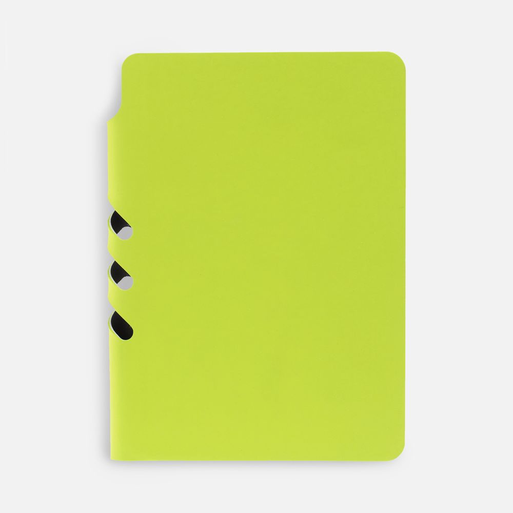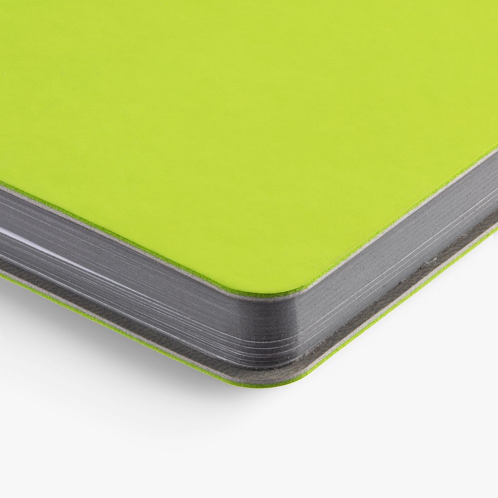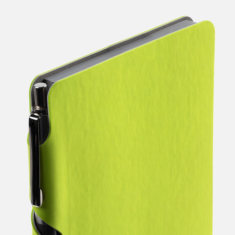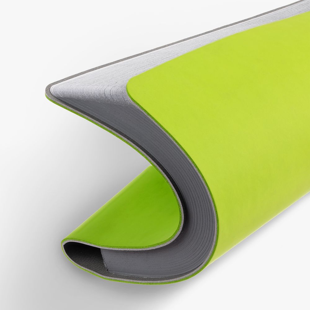 Ежедневник с гибкой обложкой выполнен из материала Soft Touch, светло-зеленый YY и серого Latte (внутренняя часть обложки). Внутри корешка — специальное место для крепления ручки размером до 15х0,9 см.