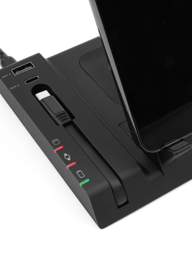 Зарядная станция Tres высшего уровня сложности позволяет заряжать до 5 гаджетов одновременно: телефон, часы Apple Watch 2–8, наушники с поддержкой протокола беспроводной зарядки Quick Charge и еще 2 устройства через кабели с разъемами USB-А и Type-C.