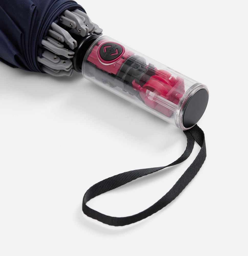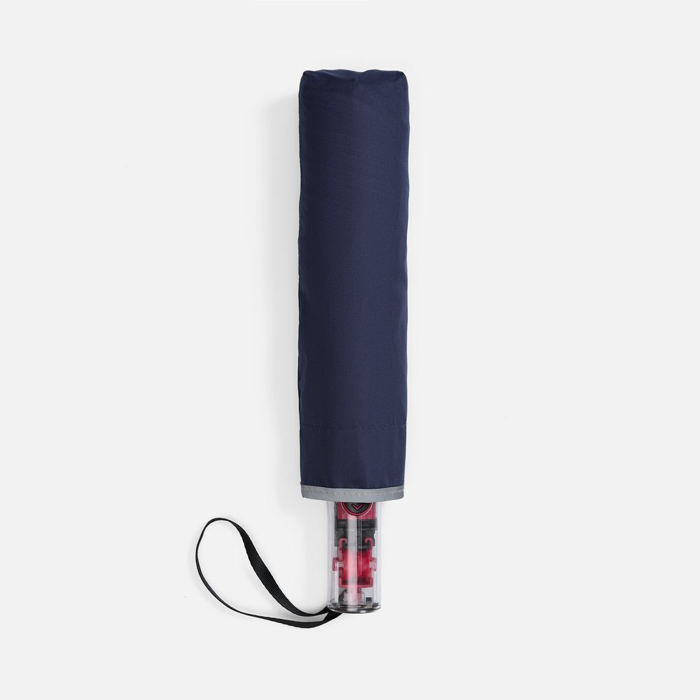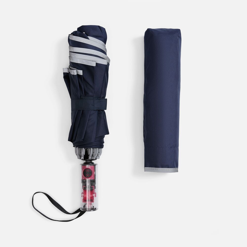Складной зонт Futurum привлекает внимание оригинальным дизайном. Складываясь после дождя, он прячет мокрую поверхность в себя, а сухая остается снаружи. Светоотражающий кант и ручка из прозрачного пластика, не скрывающая ярких деталей внутри, добавляют внешнему виду зонта футуристичности.