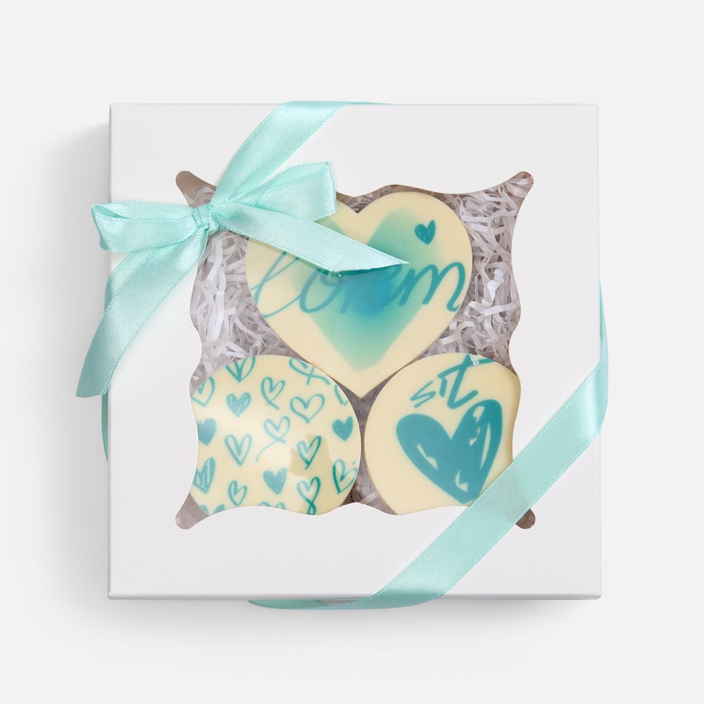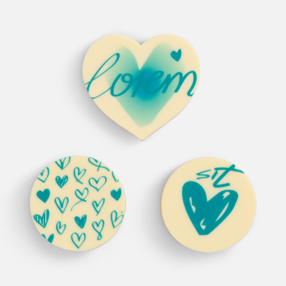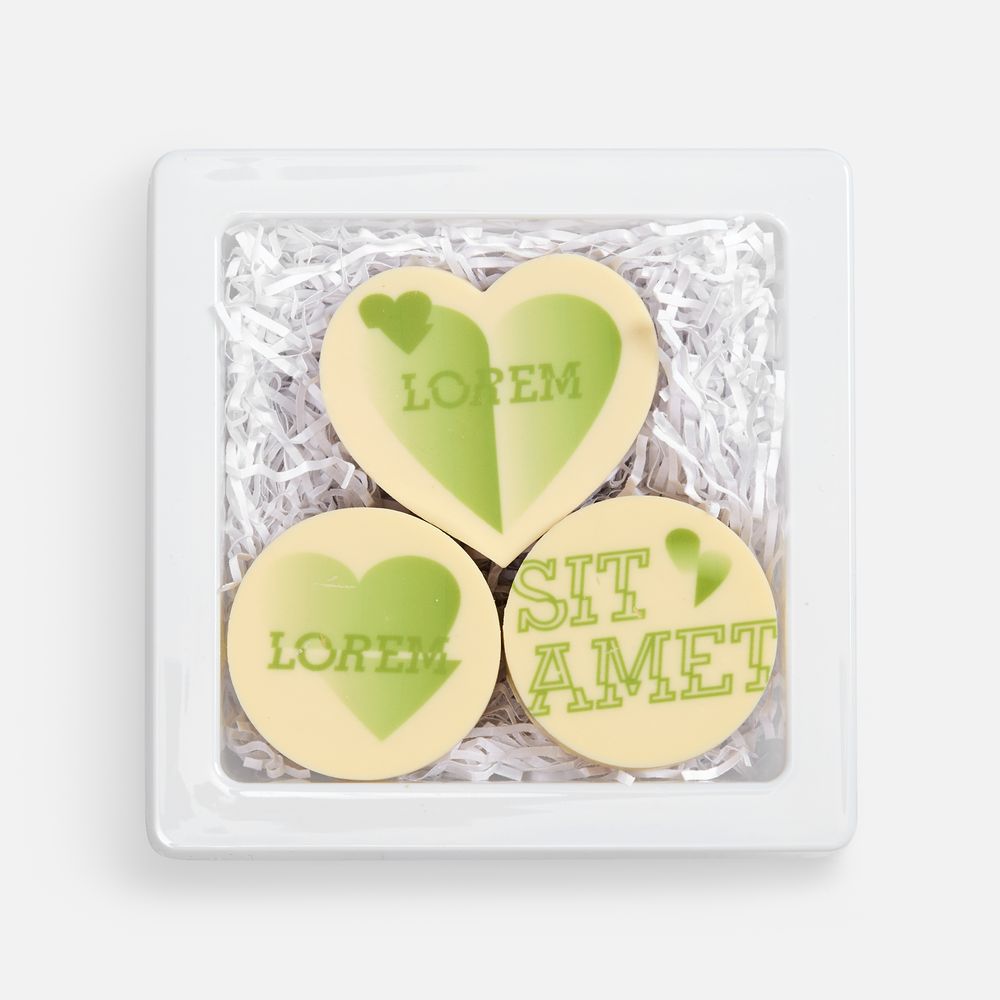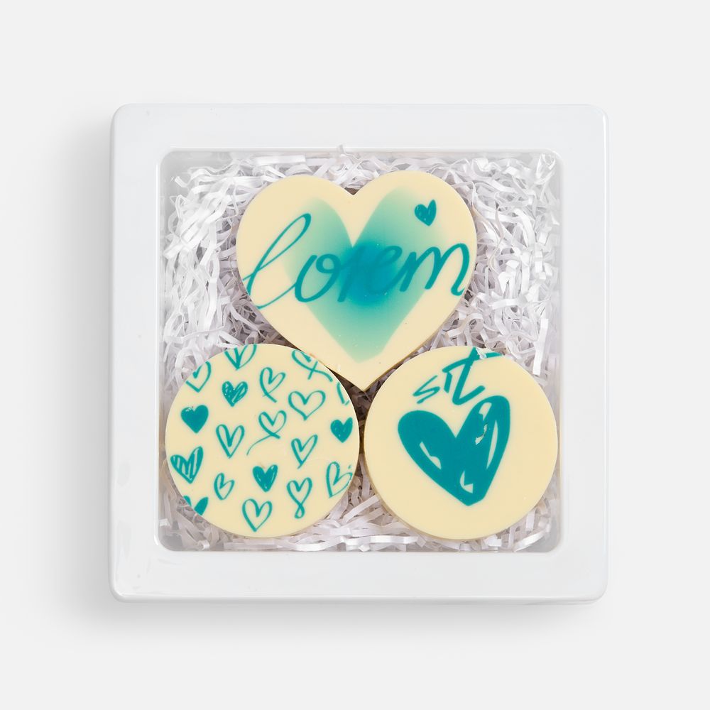 Нежное рассыпчатое печенье в глазури из белого шоколада станет изысканным угощением для особенных моментов. На шоколад безопасными пищевыми красителями наносится цветная привлекательная картинка. Набор из трех печений представлен в элегантной коробке с атласной лентой — готовый подарок, который говорит о вашем внимании к деталям. Вы можете выбрать любой цвет атласной ленты для упаковки, указав предпочтения в примечании к заказу.