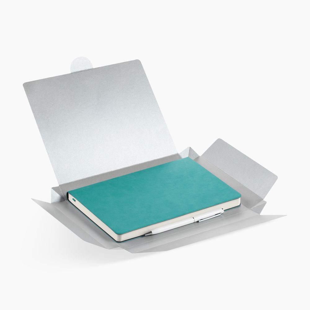 Недатированный ежедневник с гибкой обложкой из материала Latte с ляссе в цвет обложки, а также ручка в тон — в подарочной коробке из дизайнерского картона.