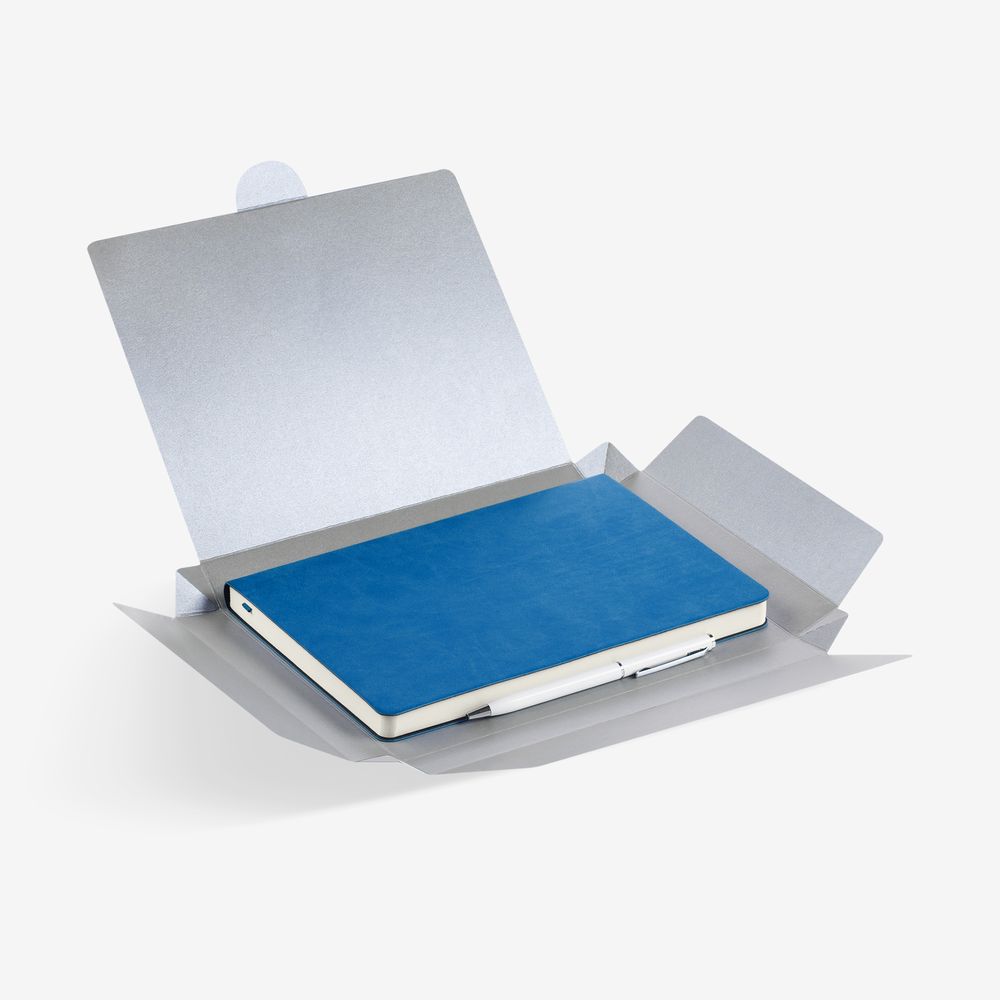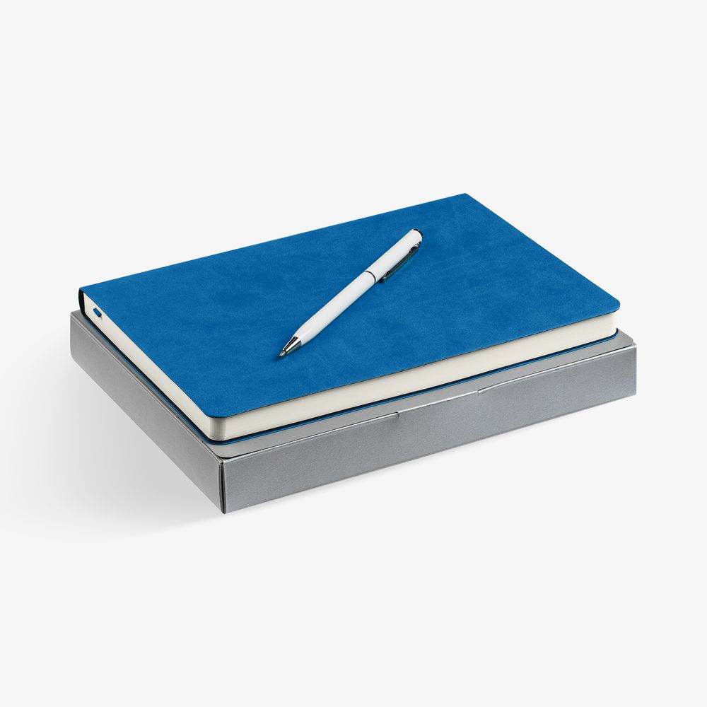 Недатированный ежедневник с гибкой обложкой из материала Latte с ляссе в цвет обложки, а также ручка в тон — в подарочной коробке из дизайнерского картона.
