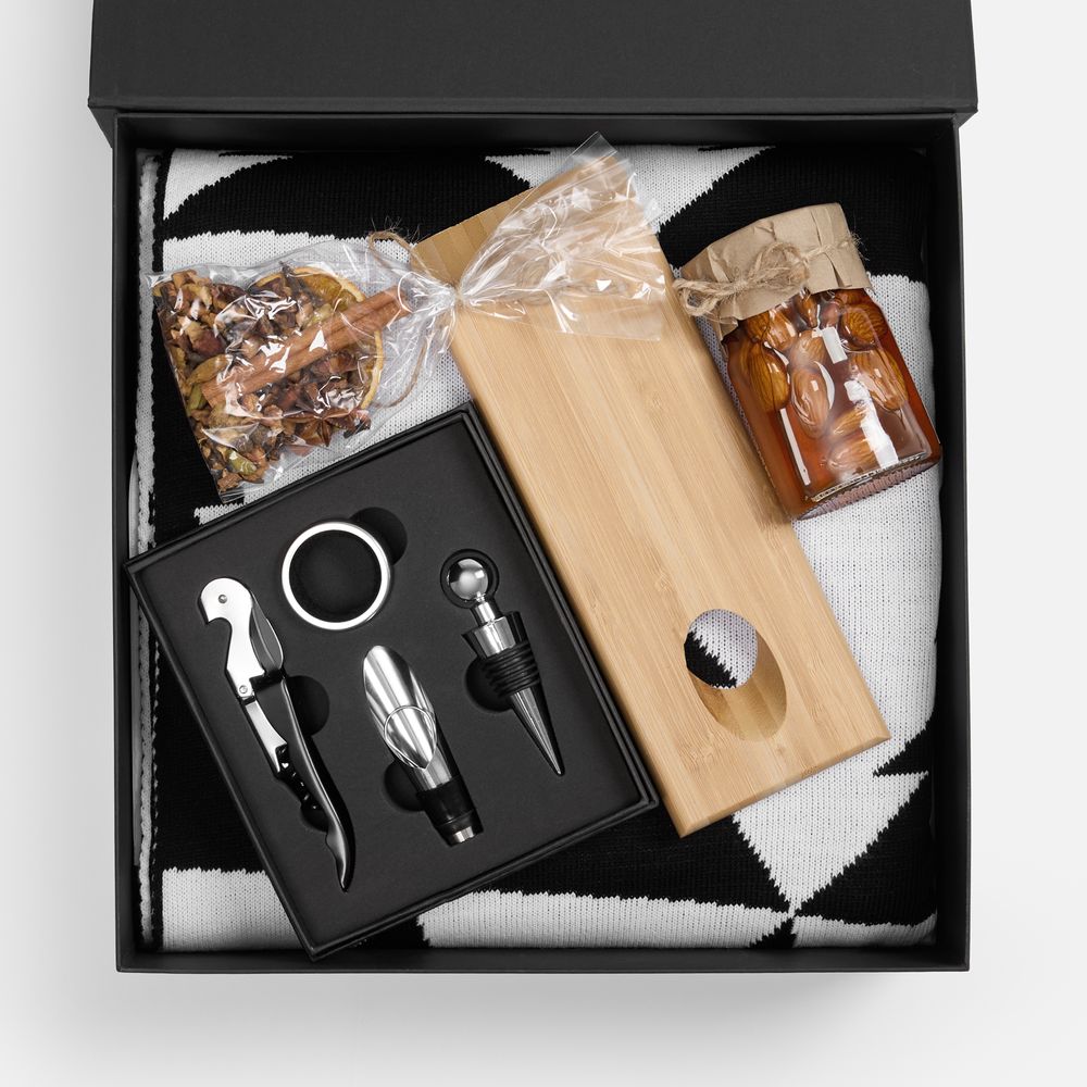Набор Spicy Weekend создан специально для томных и непременно согревающих уикендов: в такой компании получится устроить настоящий праздник удовольствия и вкуса. Функциональные винные аксессуары подарят комфорт и добавят эстетики, а мед и традиционные специи придадут домашнему глинтвейну особенный вкус и аромат. Цветовой акцент набора — стильный монохромный плед, станет обязательным атрибутом уютного зимнего вечера. В комплект входят: