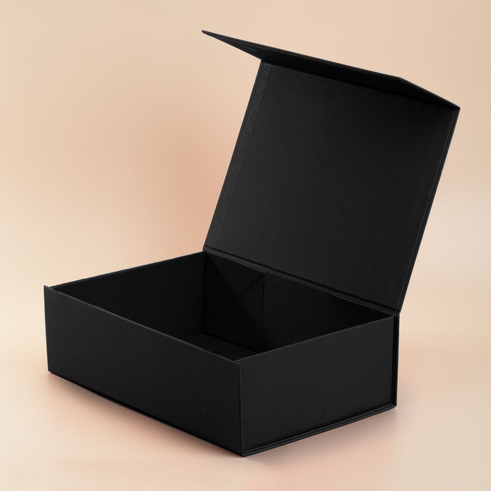 Коробка из переплетного картона, кашированного тисненой тонированной в массе бумагой, с крышкой на магните.