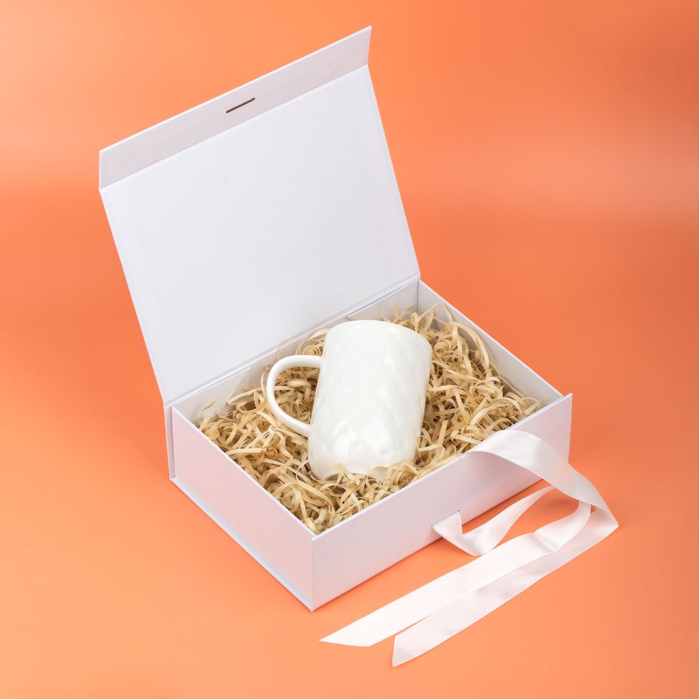 Коробка из переплетного картона, кашированного тонированной в массе крафтовой бумагой. Крышка на двух магнитах дополнительно фиксируется репсовой лентой.Толщина картона 2 мм.