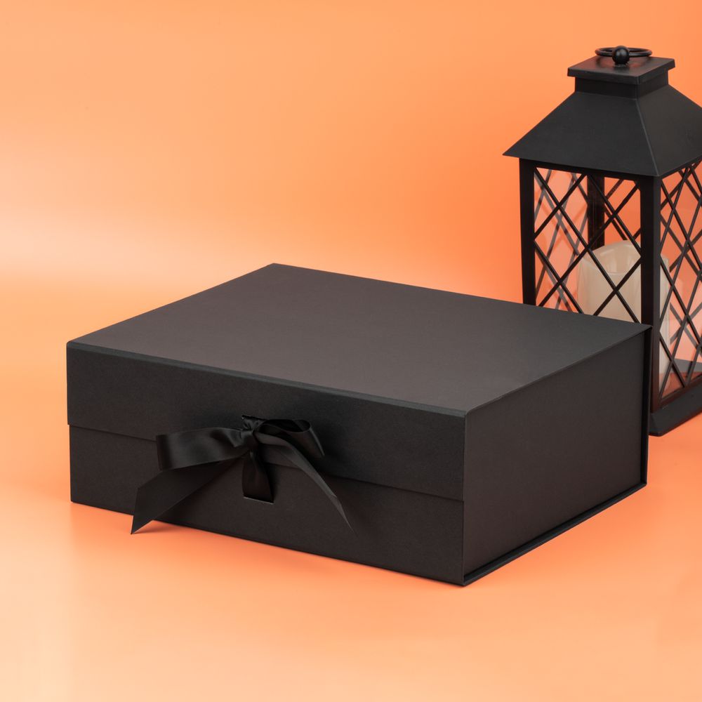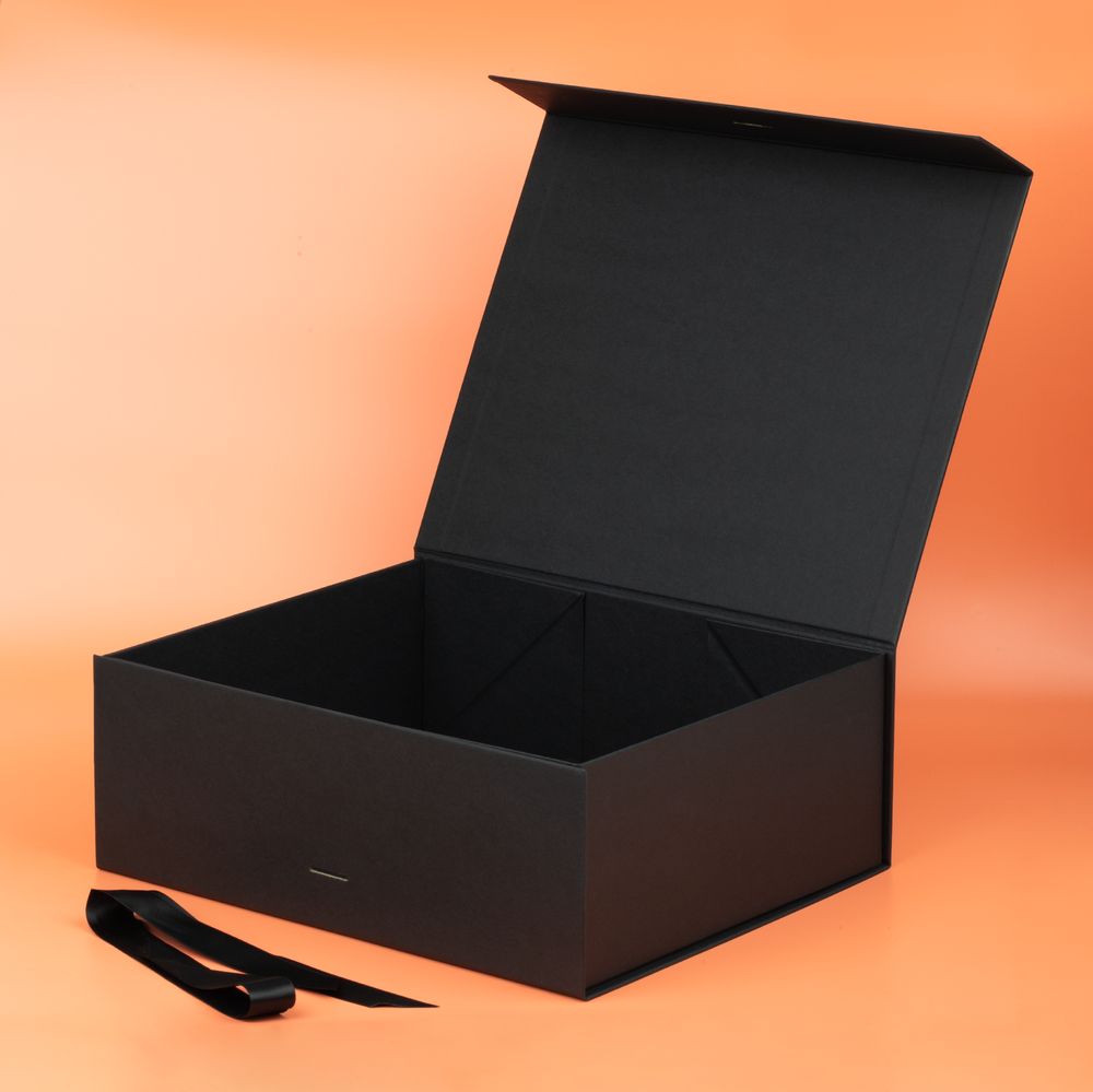 Коробка из переплетного картона, кашированного тонированной в массе крафтовой бумагой. Крышка на двух магнитах дополнительно фиксируется репсовой лентой.Толщина картона 2 мм. Поставляется в плоском виде. Сборка осуществляется на скотч.