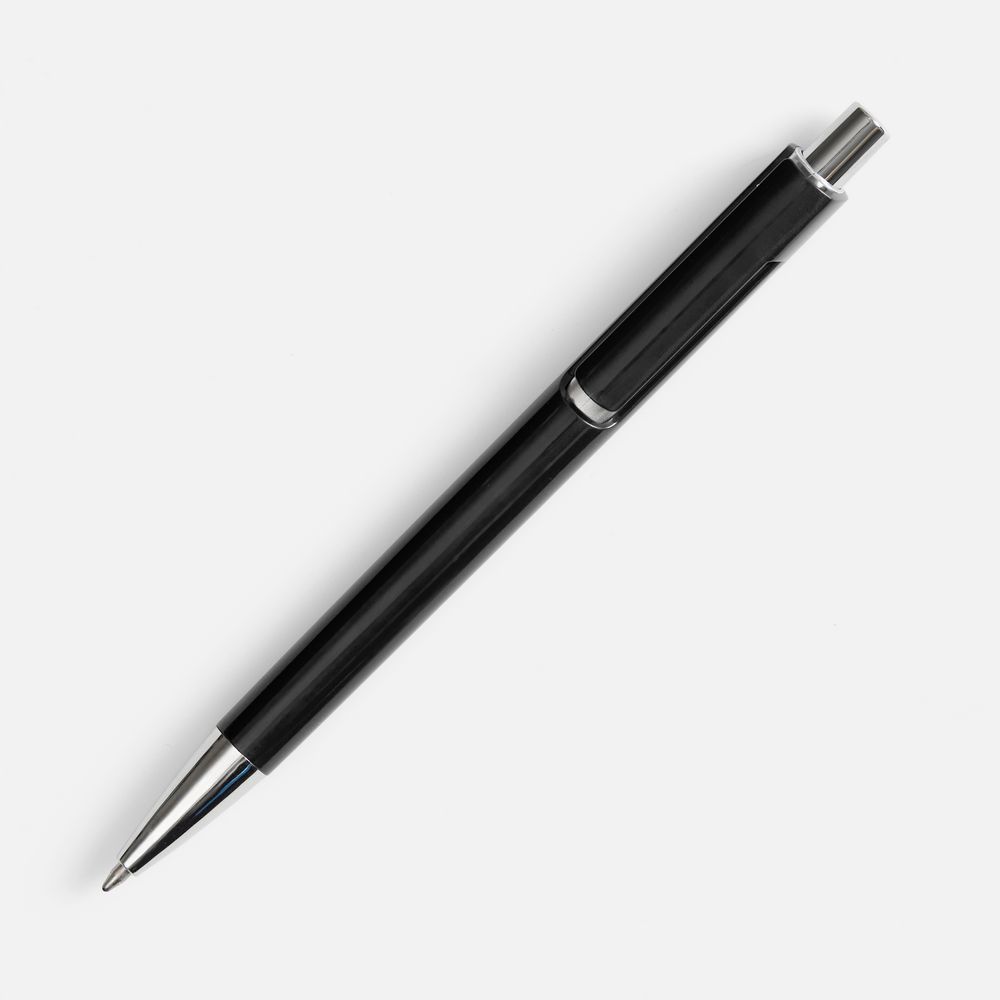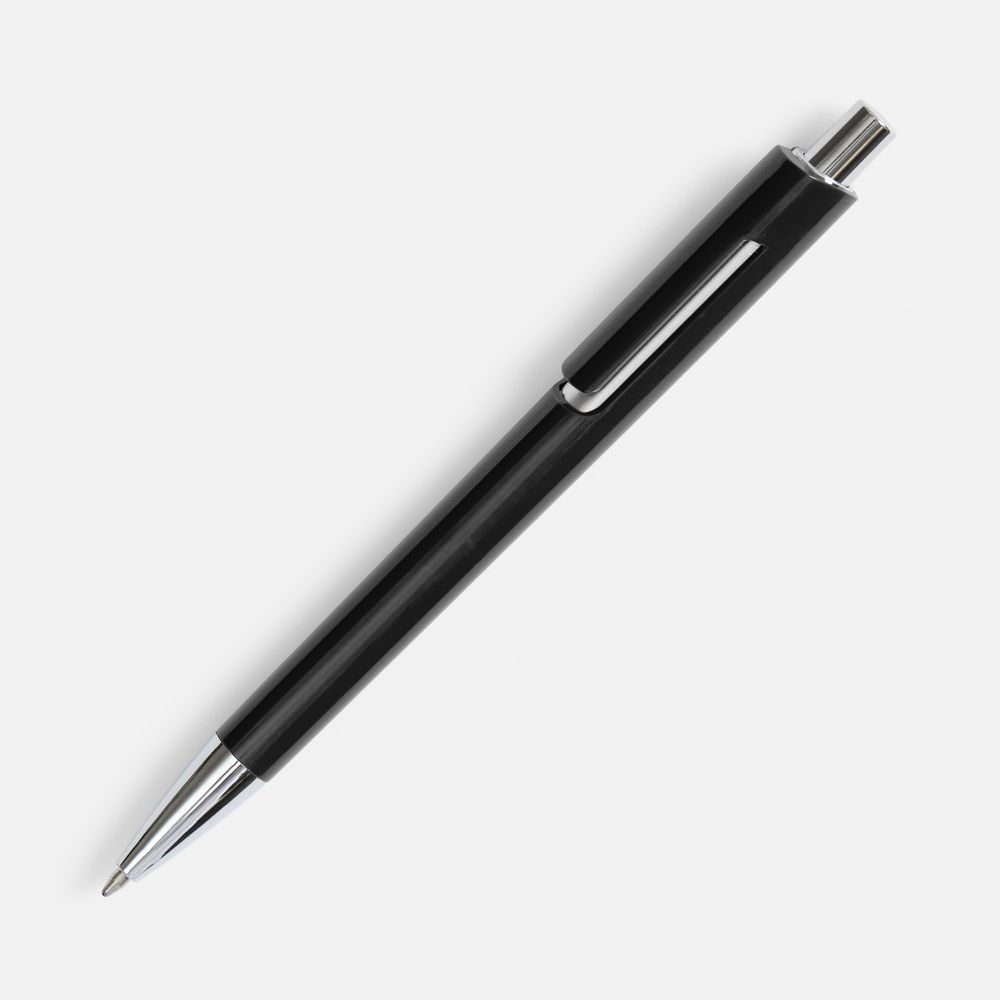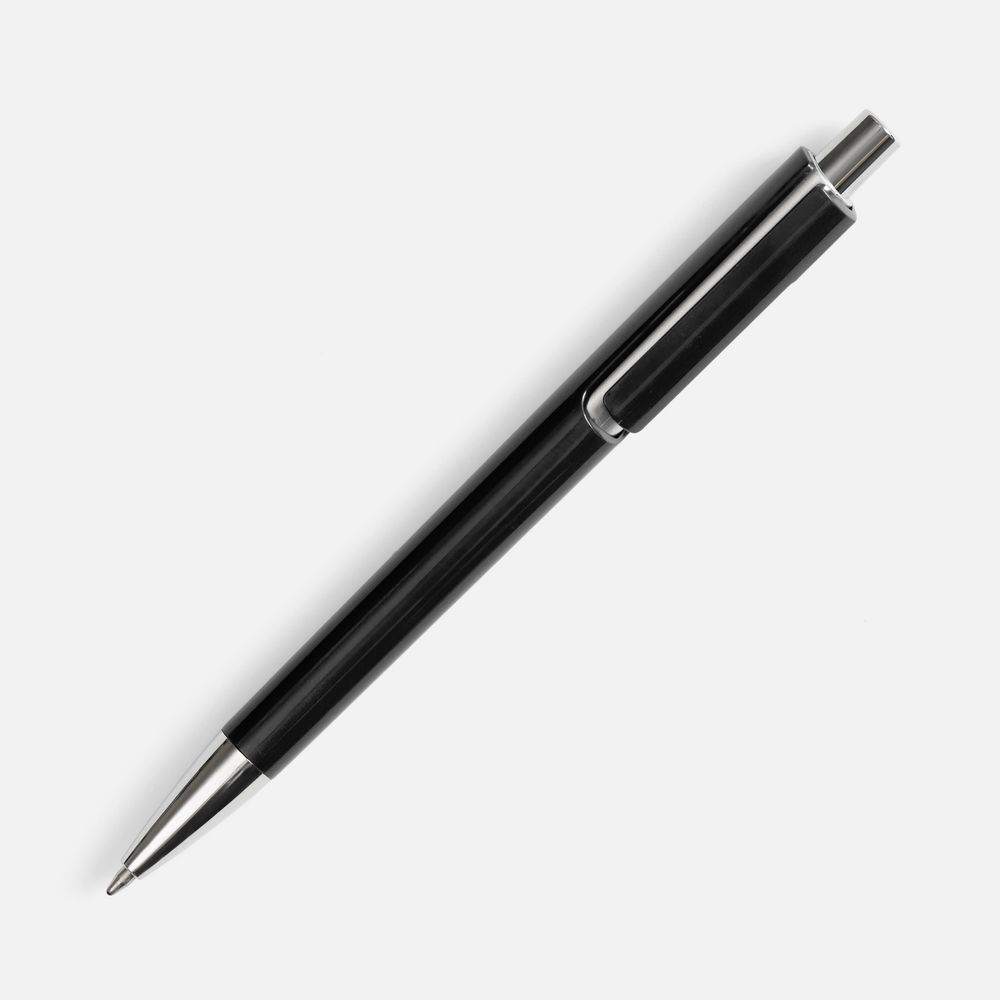 Шариковая ручка с цветным глянцевым корпусом и акцентными серебристыми деталями.