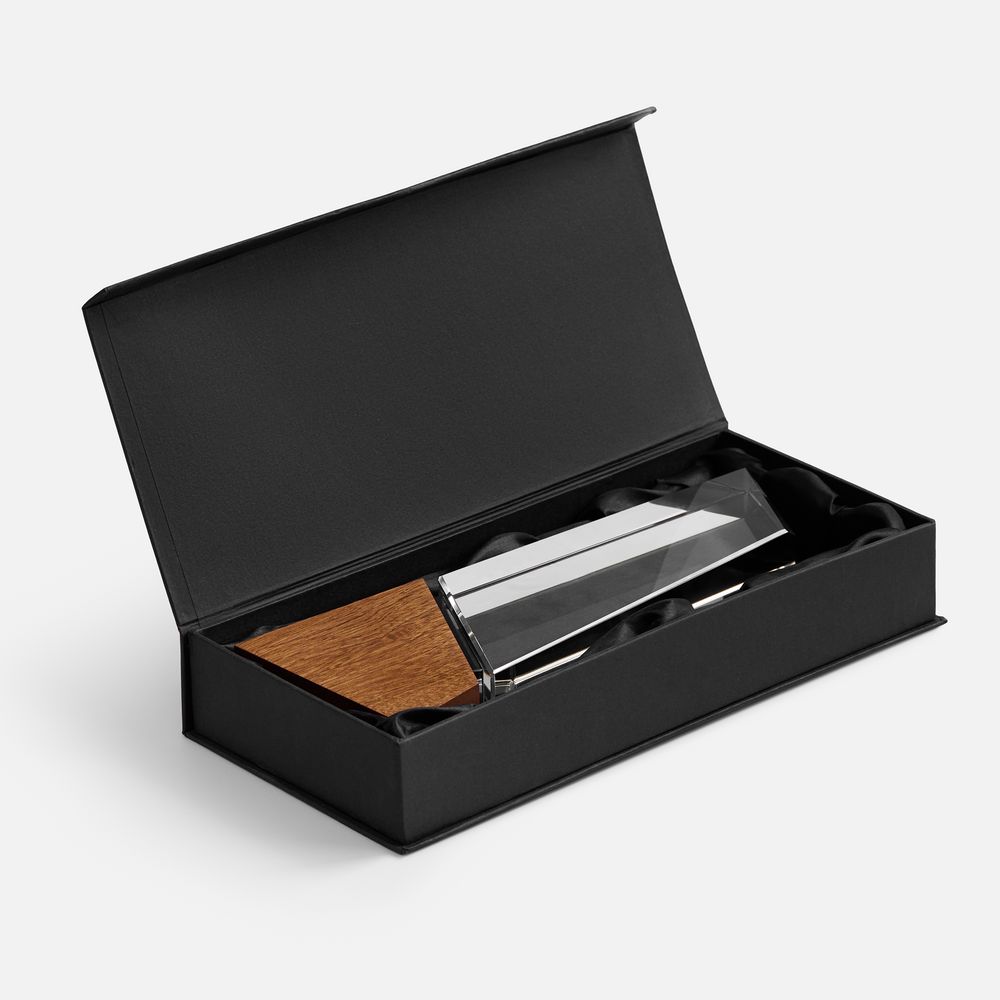 Стела изготовлена из стекла К9, в основе которого лежит оптическое боросиликатное стекло. Эту марку стекла отличает низкий процент посторонних включений, высокий показатель преломления и высокая прозрачность — идеальные качества для изготовления наград премиального уровня. Поставляется в подарочной коробке.