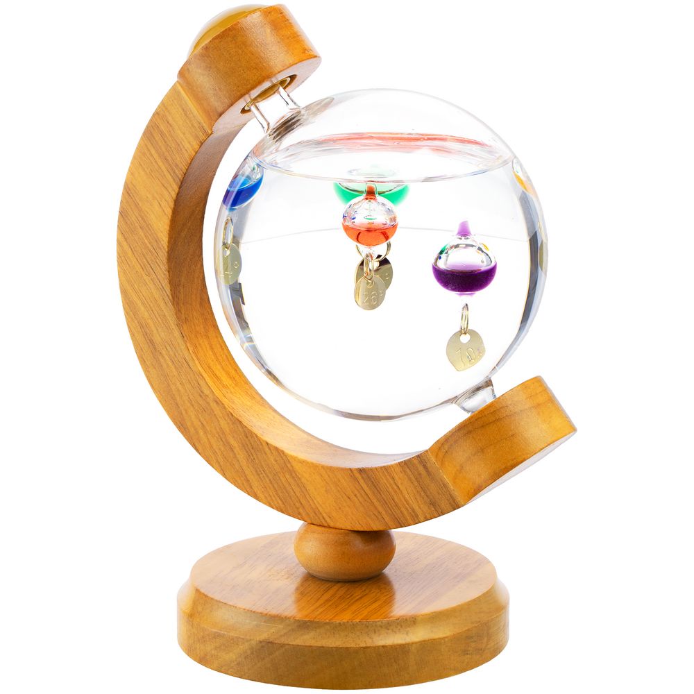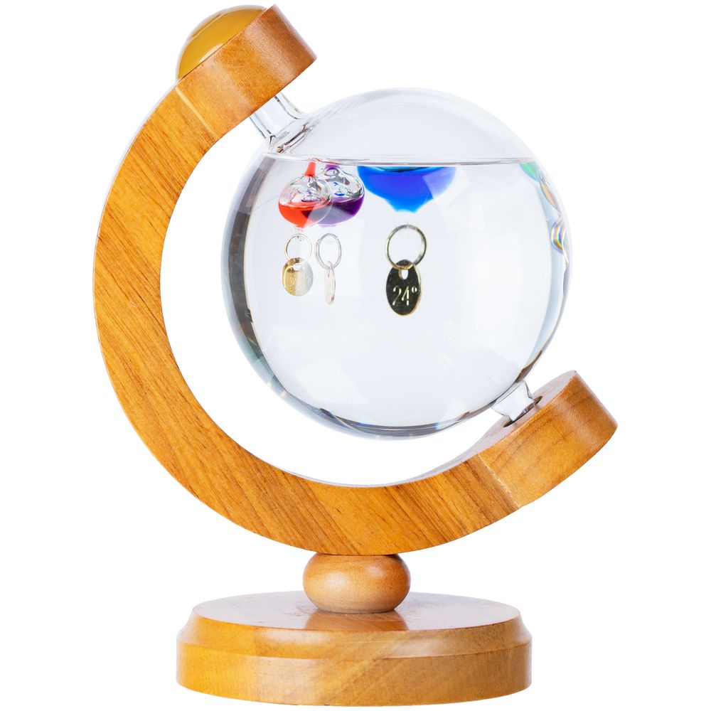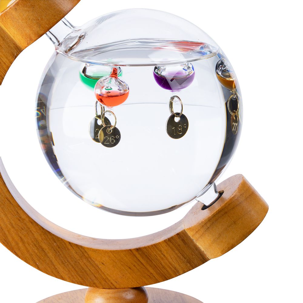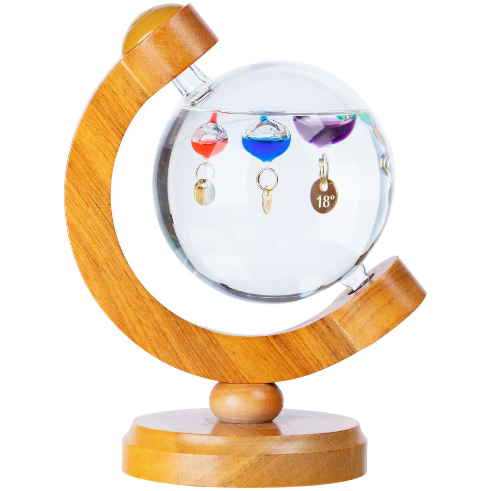 Термометр Галилео оригинальной формы, напоминающей глобус, добавит индивидуальности домашнему или офисному интерьеру. В основе его работы лежит физическая закономерность, впервые отмеченная великим Галилео Галилеем: плотность жидкости увеличивается при снижении температуры и уменьшается при ее повышении. И теперь стеклянные шарики в жидком парафине не только радуют глаз, но и позволяют с легкостью определить температуру в помещении. Термометр заполнен жидким парафином. Для использования в помещении. Температура определяется по значению на самом верхнем всплывшем шарике.