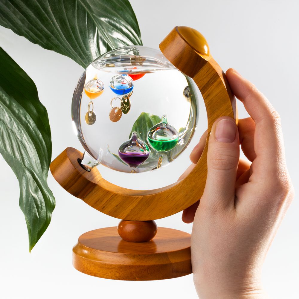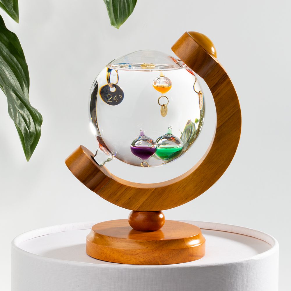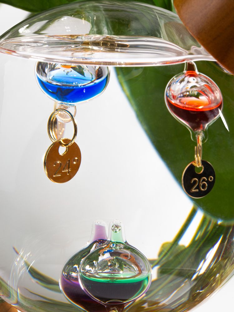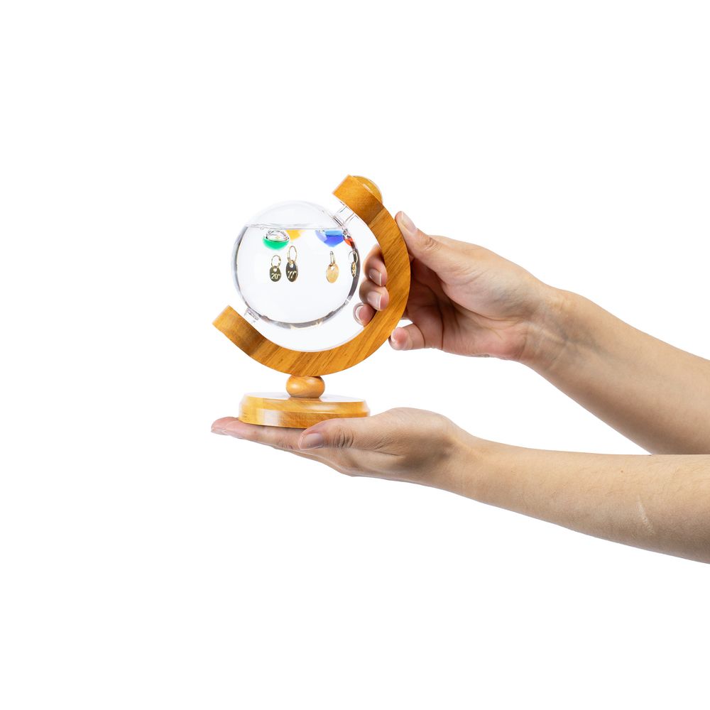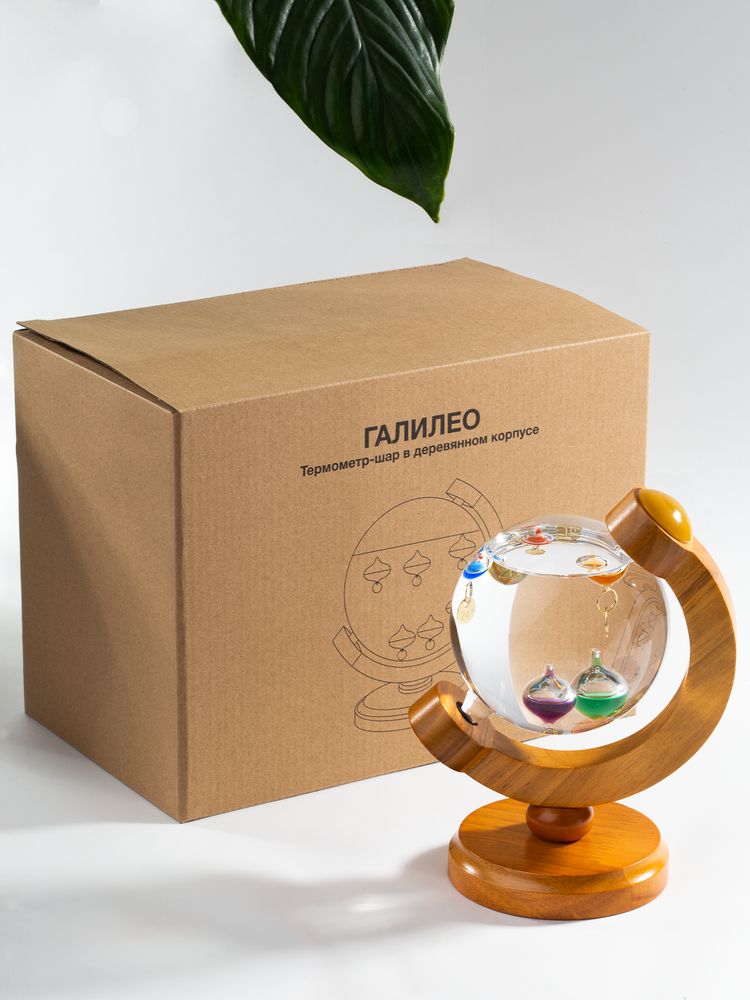 Термометр Галилео оригинальной формы, напоминающей глобус, добавит индивидуальности домашнему или офисному интерьеру. В основе его работы лежит физическая закономерность, впервые отмеченная великим Галилео Галилеем: плотность жидкости увеличивается при снижении температуры и уменьшается при ее повышении. И теперь стеклянные шарики в жидком парафине не только радуют глаз, но и позволяют с легкостью определить температуру в помещении. Термометр заполнен жидким парафином. Для использования в помещении. Температура определяется по значению на самом верхнем всплывшем шарике.