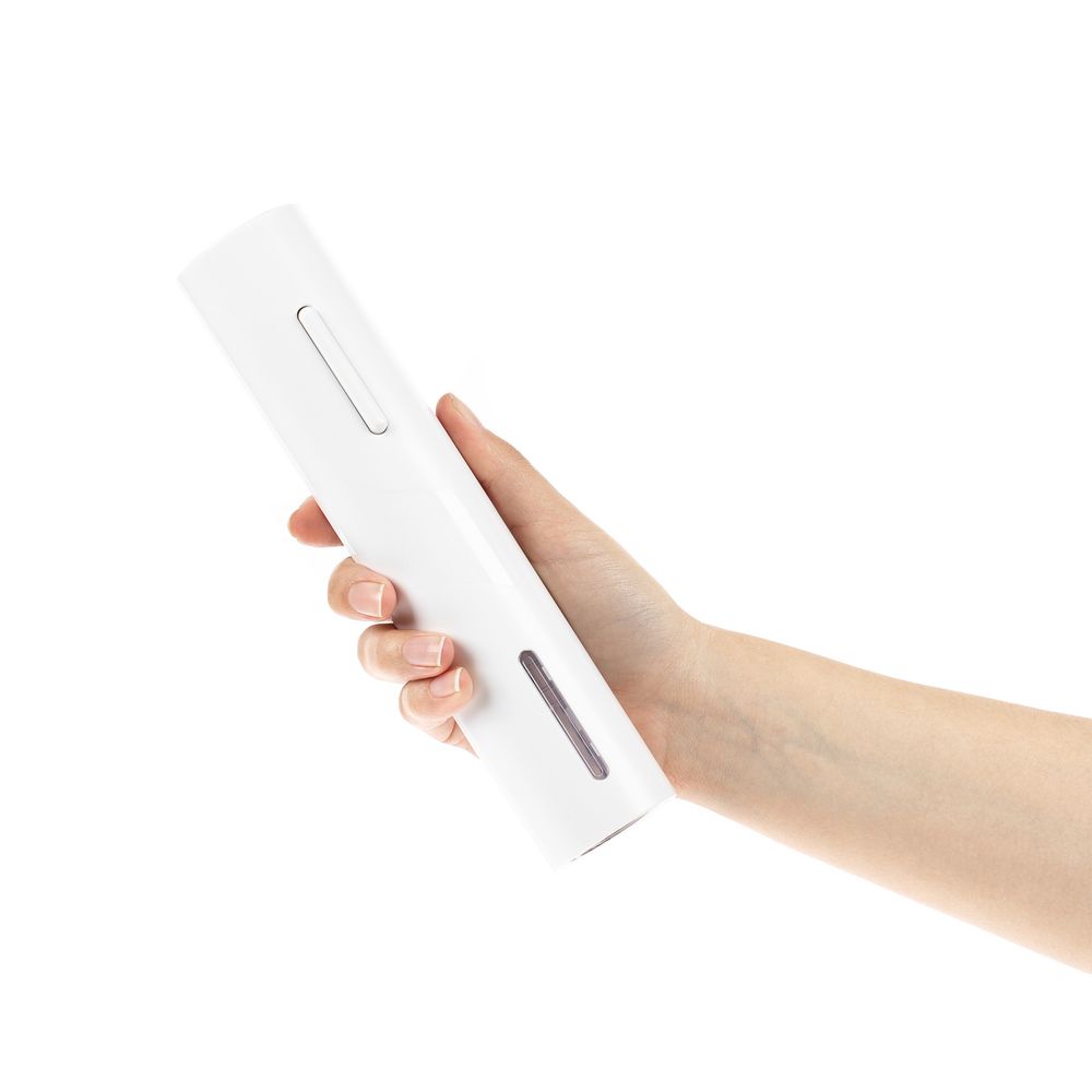 Чтобы открыть бутылку, просто поместите электрический штопор на горлышко винной бутылки, нажмите нижнюю кнопку — лезвие вкрутится в пробку, нажмите верхнюю — бутылка будет открыта. В нижней части корпуса расположен нож для фольги.