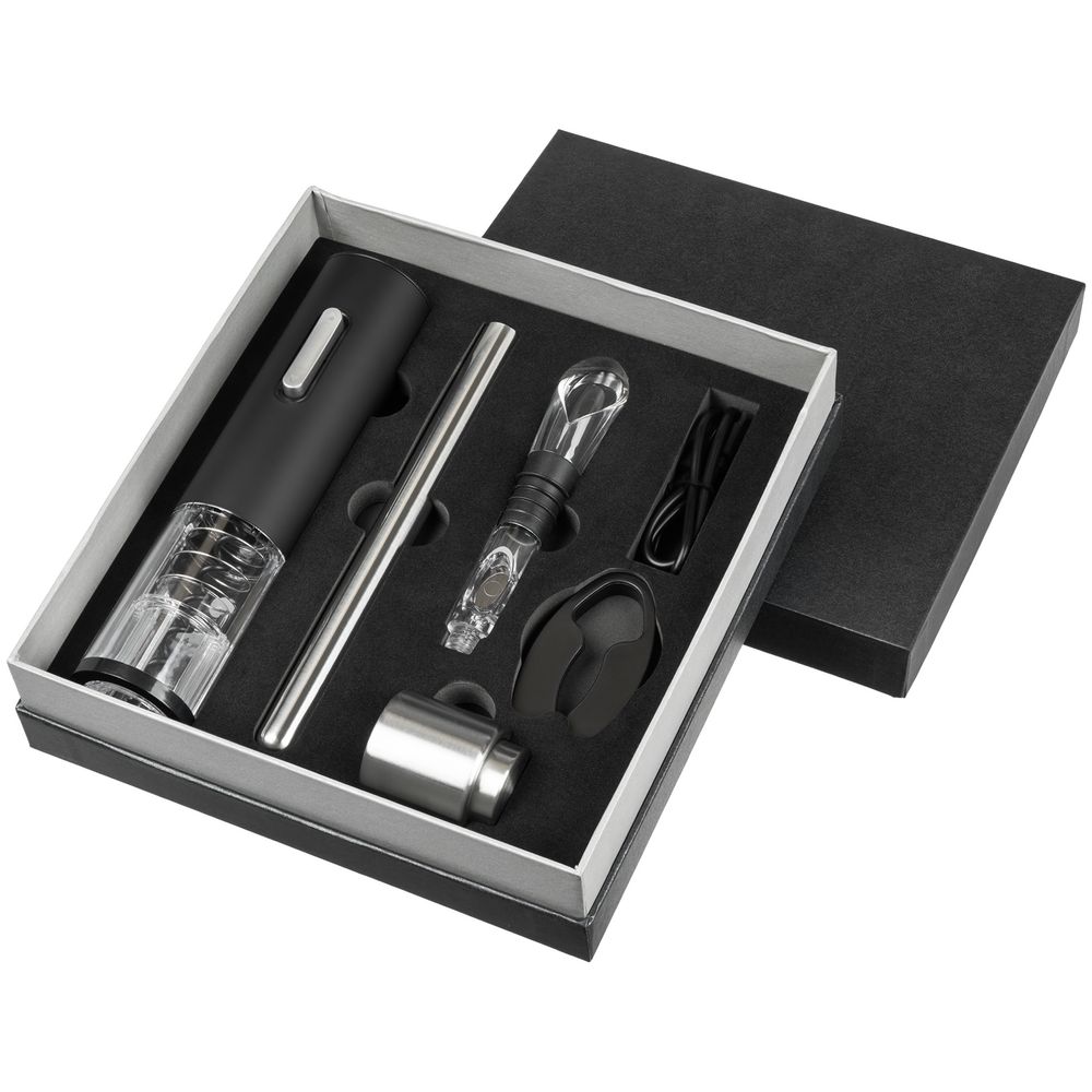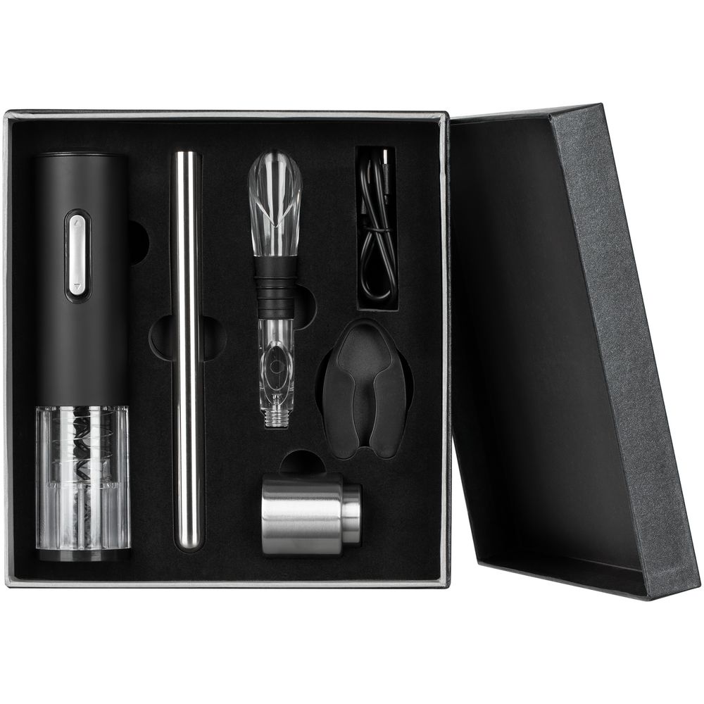 Набор Wine Diesel — настоящая находка для ценителей вин. Благодаря продуманному дизайну использование автоматического штопора практически не требует участия человека. Изящный чиллер поддерживает температуру напитка до часа, удобная разливочная воронка дополнительно аэрирует вино и не позволяет пролить его мимо бокала, а небольшая вакуумная пробка сохраняет вкусовые свойства напитка в течение нескольких дней. Набор поставляется в подарочной коробке.