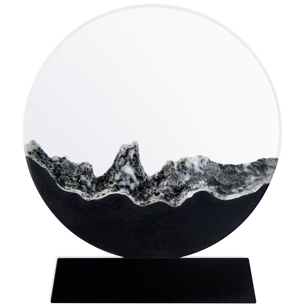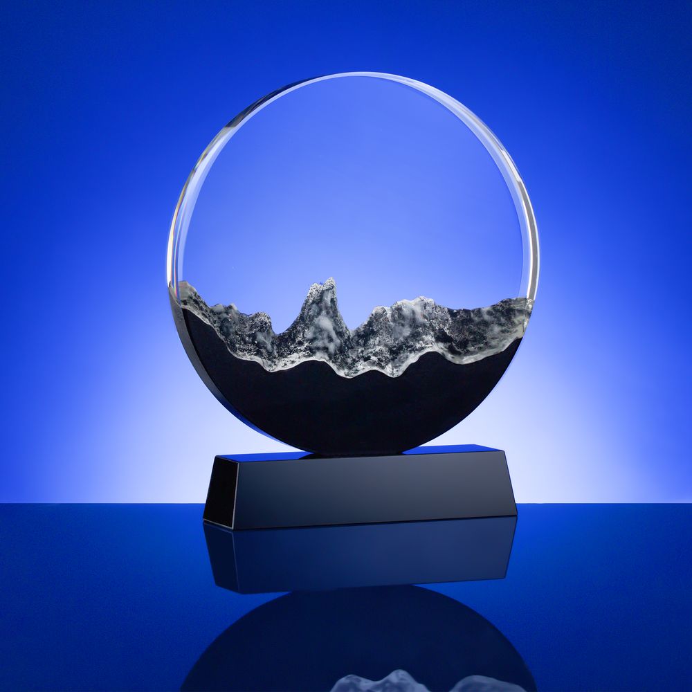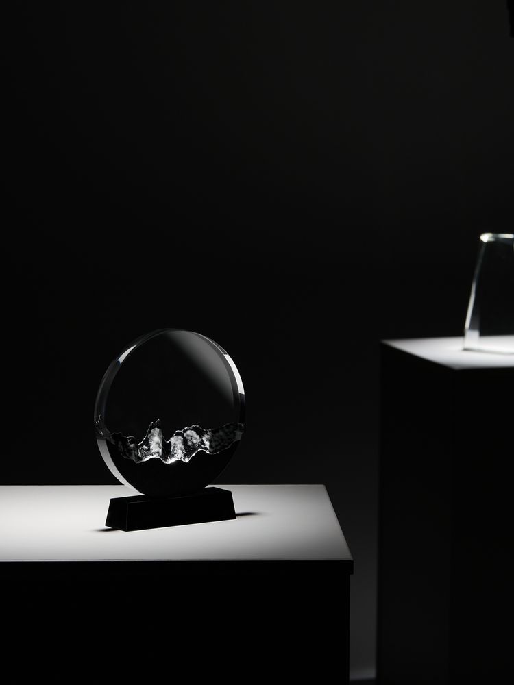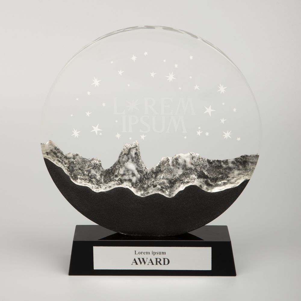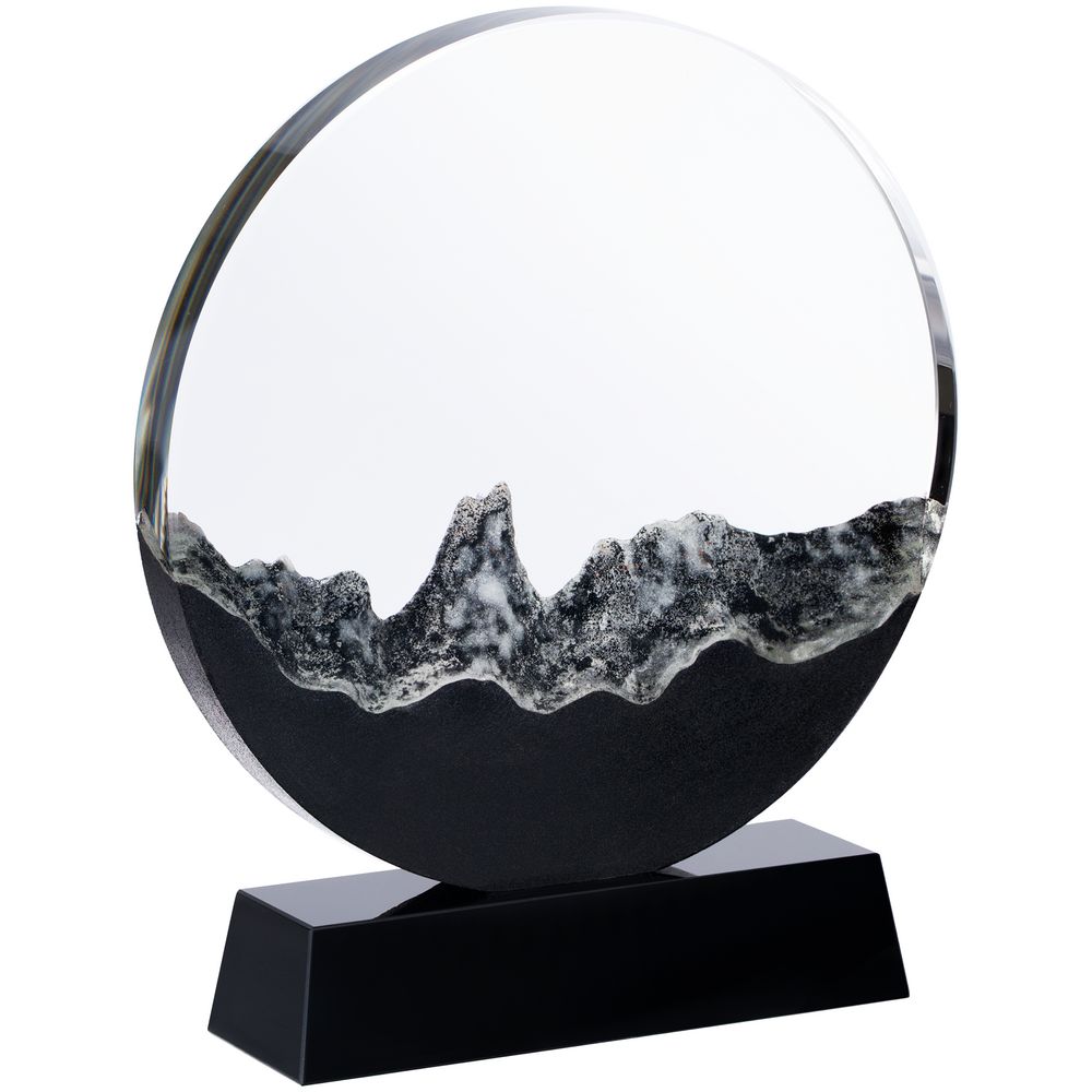 Прозрачная круглая часть и черное основание стелы изготовлены из премиального стекла К9, в основе которого лежит оптическое боросиликатное стекло. Эту марку стекла отличает низкий процент посторонних включений, высокий показатель преломления и высокая прозрачность — идеальные качества для изготовления наград премиального уровня. Нижняя часть стелы выполнена при помощи каменного литья из смеси специальной смолы с кварцевым черным и белым песком, тщательно отшлифованной после спекания при низкой температуре. Такой технологический прием создает завораживающую картинку внутри самой стелы, напоминающую горный хребет: яркий символ как преодоления, так и умиротворения.
