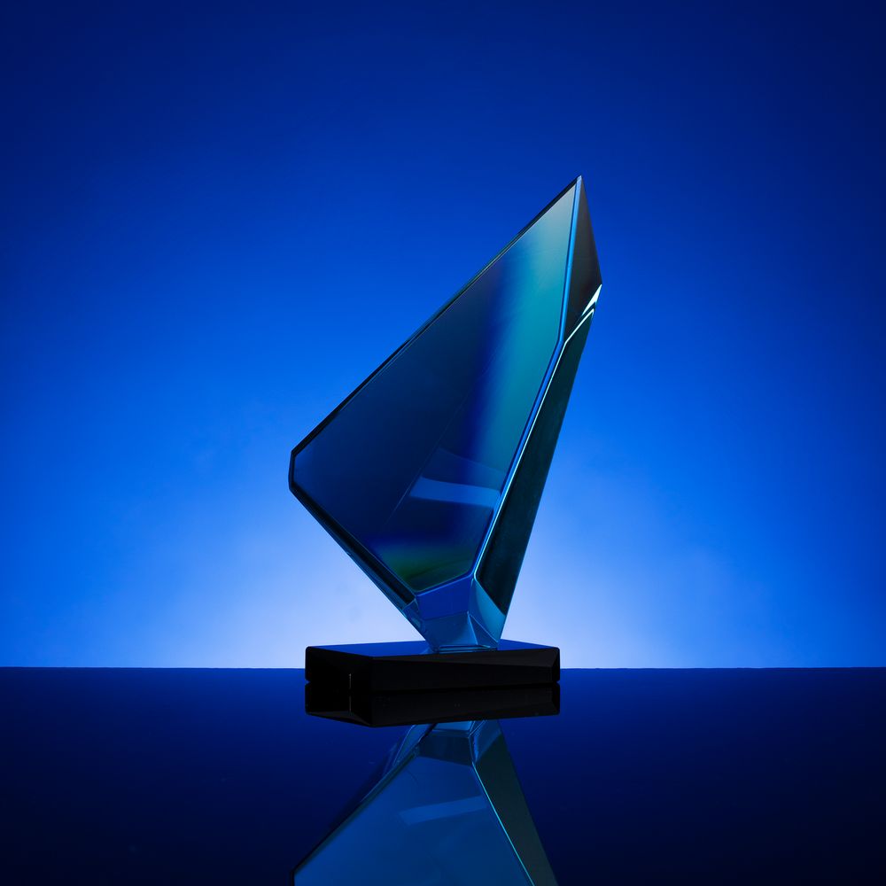 Стела изготовлена из стекла К9, в основе которого лежит оптическое боросиликатное стекло. Эту марку стекла отличает низкий процент посторонних включений, высокий показатель преломления и высокая прозрачность — идеальные качества для изготовления наград премиального уровня.