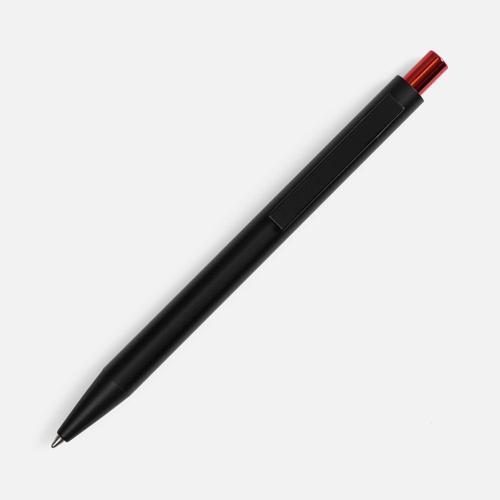 Ручка строгих форм в черном матовом корпусе с цветными деталями, которая точно может удивить, — гравировка на ней вскрывается цветом в тон кнопке.