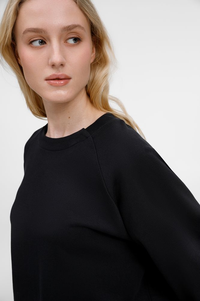 Горловина по рукаву — реглан выполнена резинкой 2х2, а спереди и сзади — из основного полотна