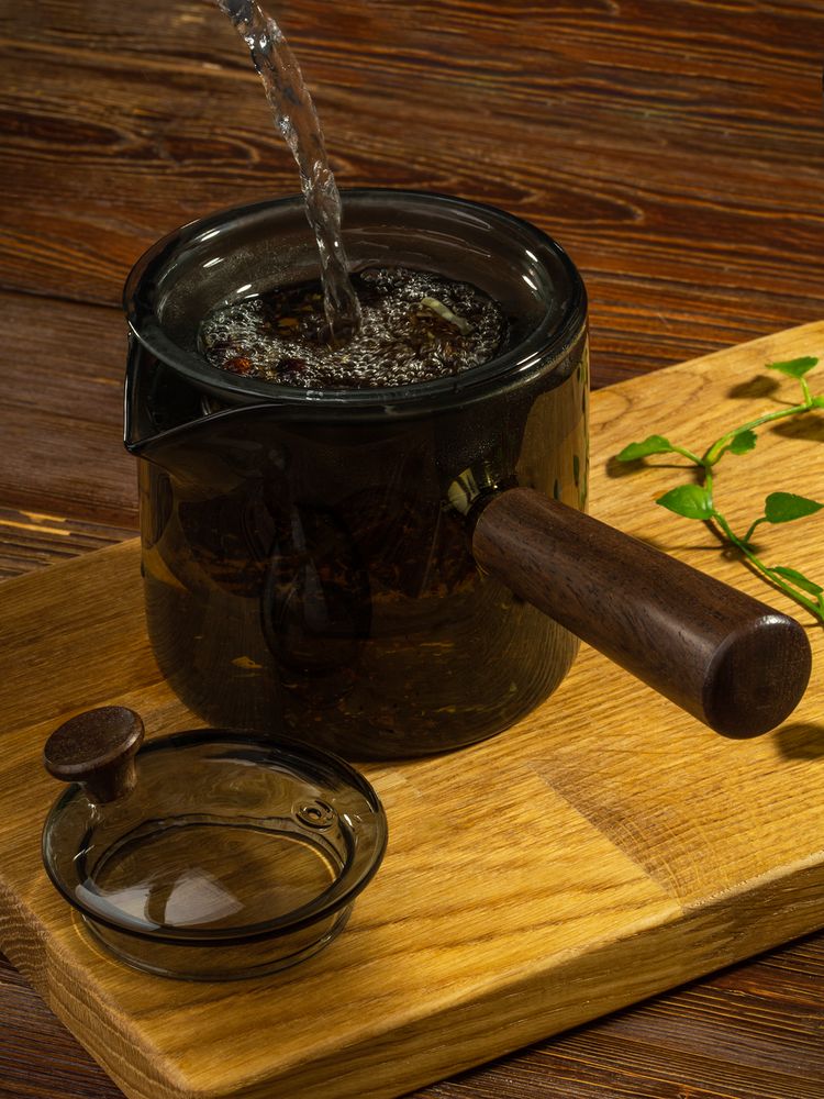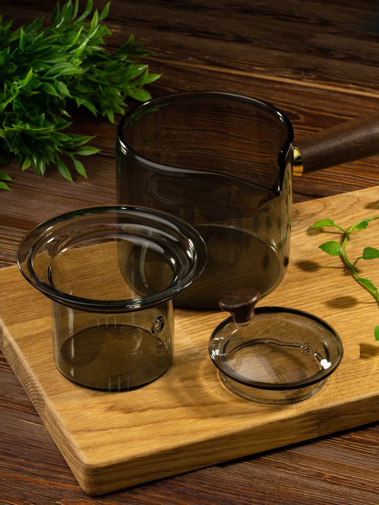 Проводник в мир спокойствия — чайник-ковш Hazy. Его мягкие линии, приглушенные цвета, стильная комбинация стекла и дерева создают атмосферу туманного утра, когда хочется укутаться в плед и насладиться чашкой горячего чая. Стеклянное сито с узкими прорезями поможет заварить чистый чай без чаинок, а эргономичная ручка — с удобством использовать чайник, не боясь обжечься.