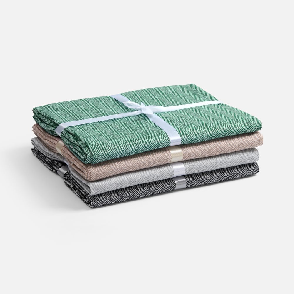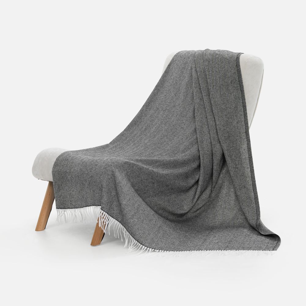 Классический рисунок «елочка» не слишком привлекает внимание, но в то же время добавляет изюминки. Смешанный состав пряжи продлевает срок службы и существенно облегчает уход за пледом.