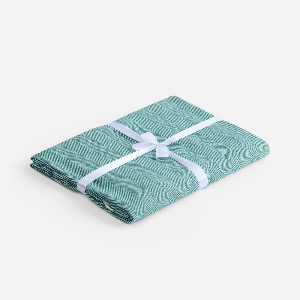 Классический рисунок «елочка» не слишком привлекает внимание, но в то же время добавляет изюминки. Смешанный состав пряжи продлевает срок службы и существенно облегчает уход за пледом.