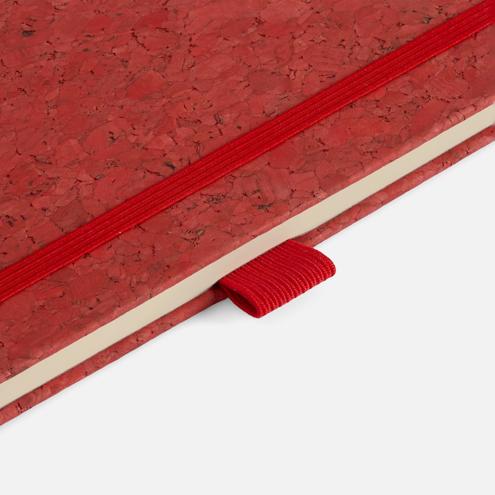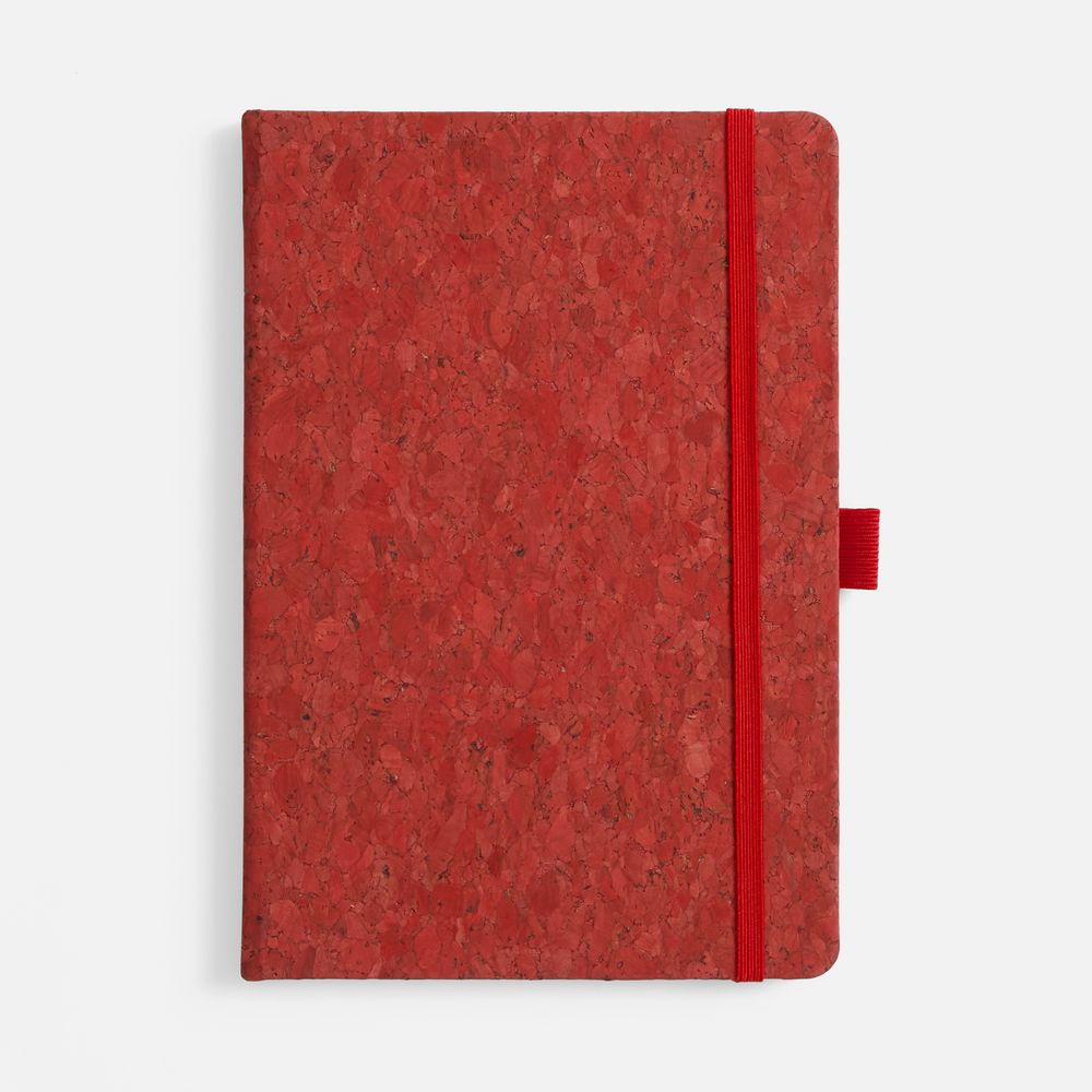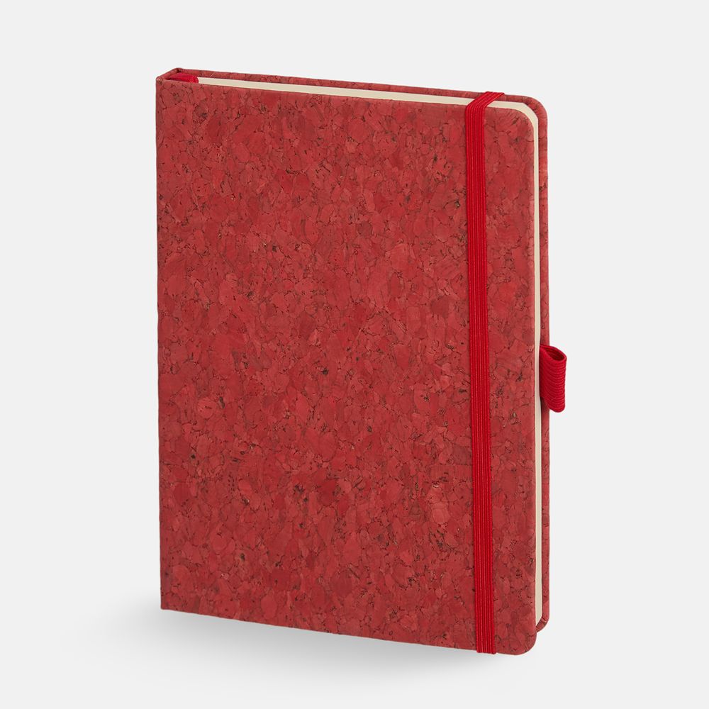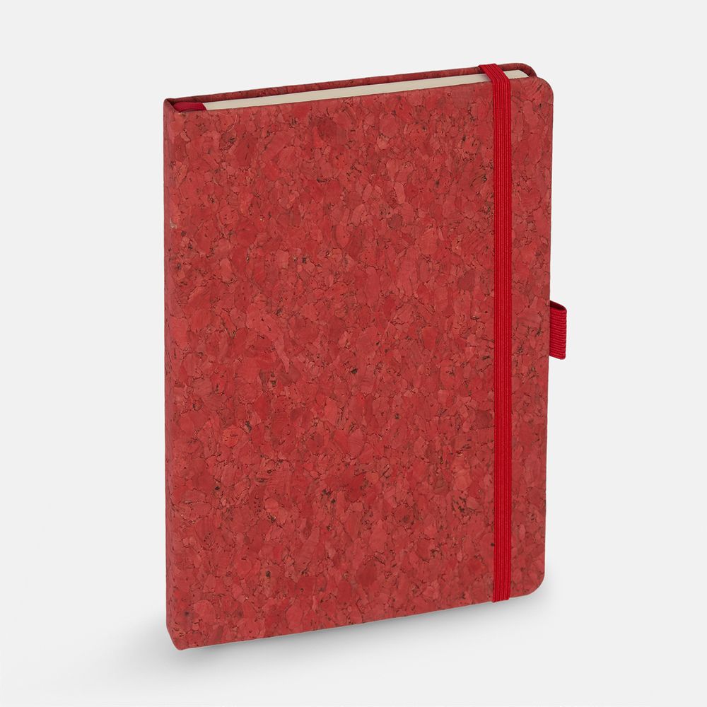 Блокнот с твердой обложкой из натуральной окрашенной пробки, дополнен петлей-резинкой для ручки, ляссе и резинкой в цвет обложки.