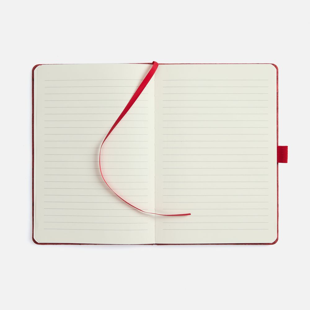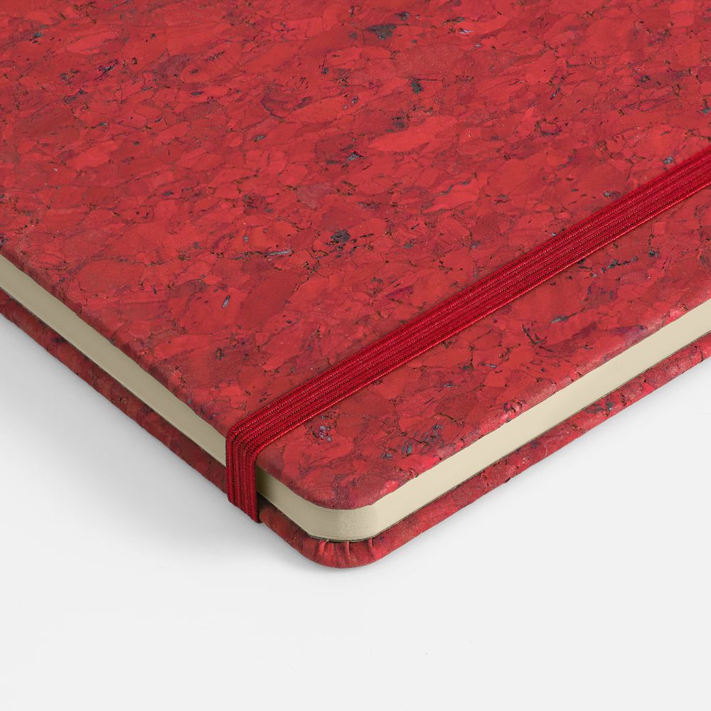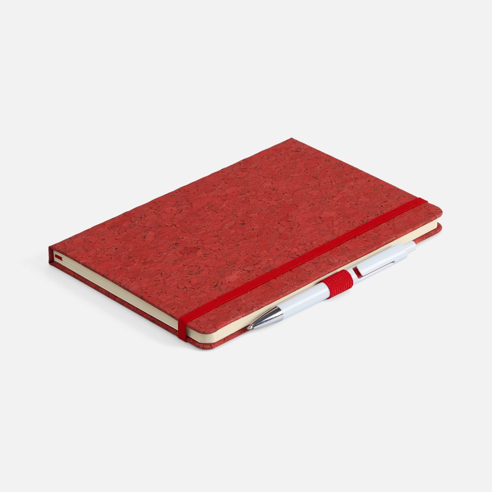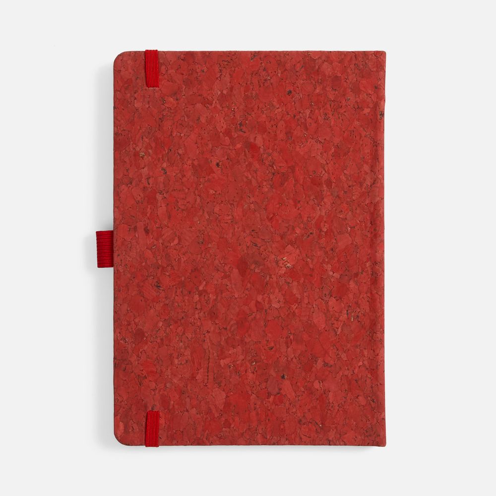 Блокнот с твердой обложкой из натуральной окрашенной пробки, дополнен петлей-резинкой для ручки, ляссе и резинкой в цвет обложки.