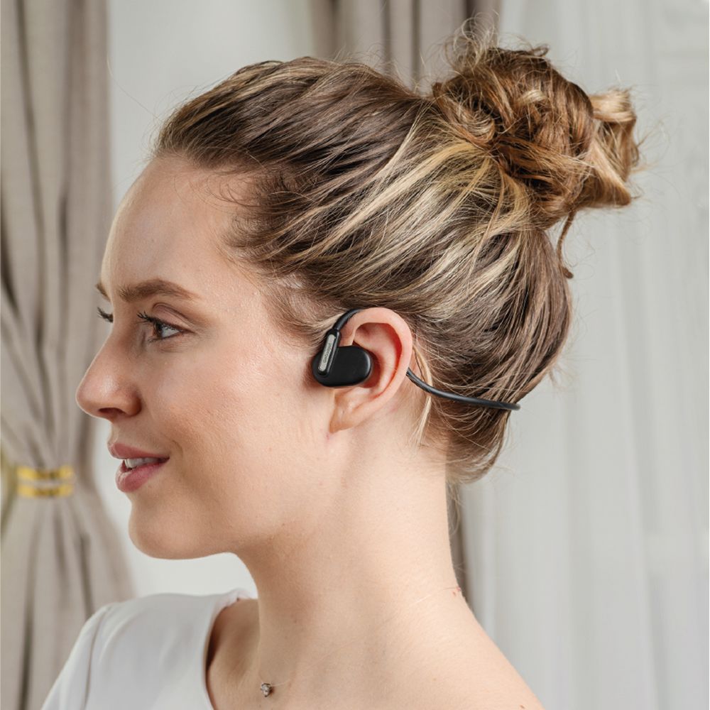 Беспроводные наушники с зашейной дужкой удобно сидят и не выпадают из ушей. Направленные динамики обеспечивают высокое качество звука. Лучше всего подходят для работы в офисе и прослушивания фоновой музыки.