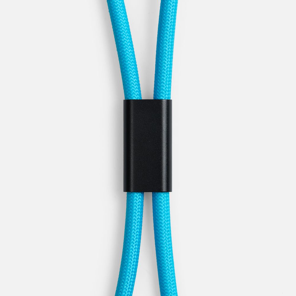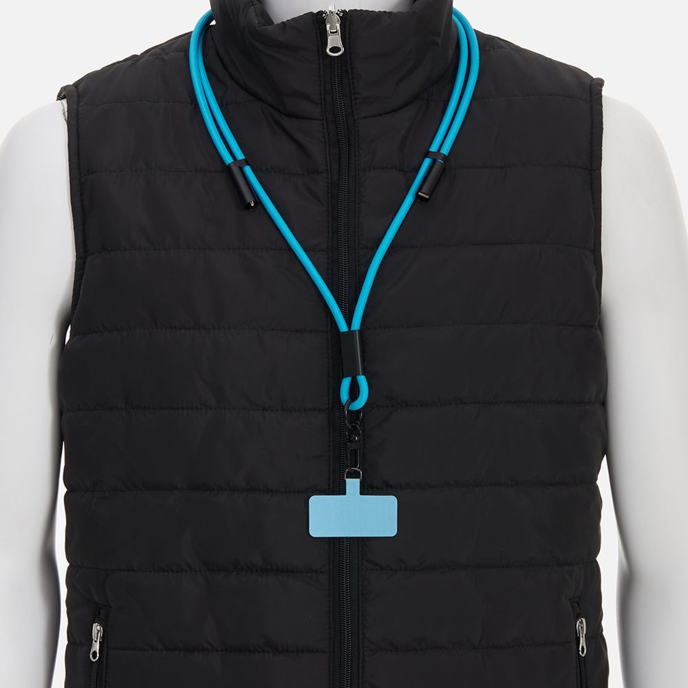 Важно: Для крепления кабеля телефон должен иметь чехол. Если ланьярд распускается под тяжестью смартфона, убедитесь, что среднее из трех колец фурнитуры находится по центру ланьярда (на шее под затылком), а не сбоку. Соседние ветви оплетки должны идти вместе, без зазоров, так достигается трение ткани о ткань. Слишком тяжелые смартфоны (диагональ 6,9" и более) могут распускать ланьярд при энергичных движениях.