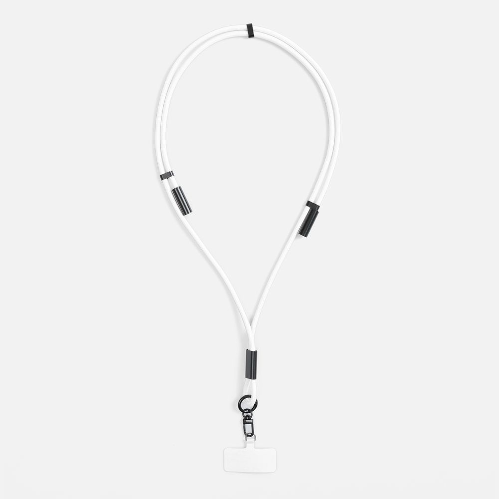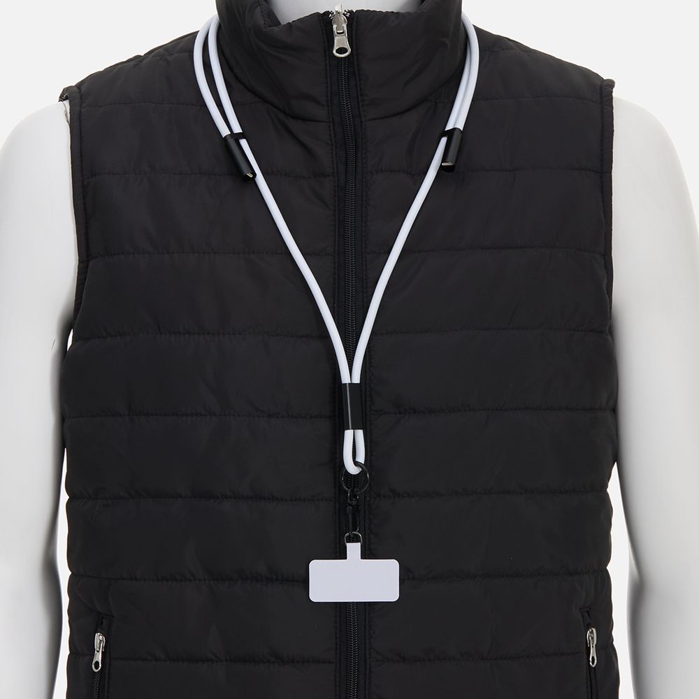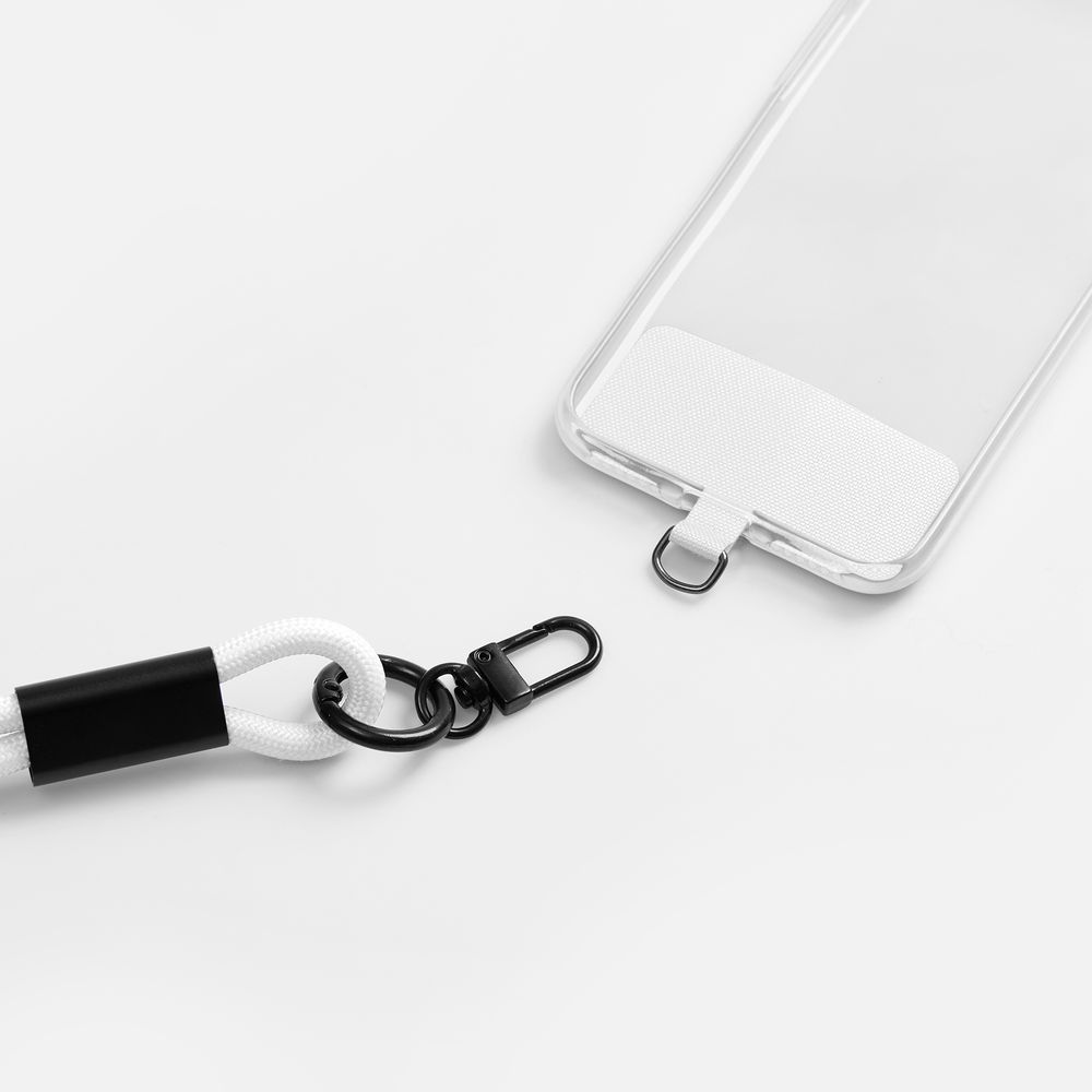Важно: Для крепления кабеля телефон должен иметь чехол. Если ланьярд распускается под тяжестью смартфона, убедитесь, что среднее из трех колец фурнитуры находится по центру ланьярда (на шее под затылком), а не сбоку. Соседние ветви оплетки должны идти вместе, без зазоров, так достигается трение ткани о ткань. Слишком тяжелые смартфоны (диагональ 6,9" и более) могут распускать ланьярд при энергичных движениях.