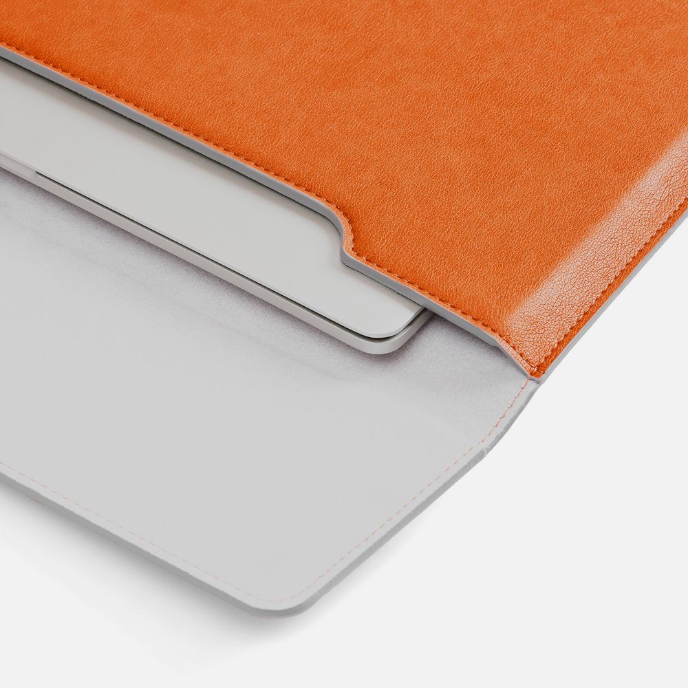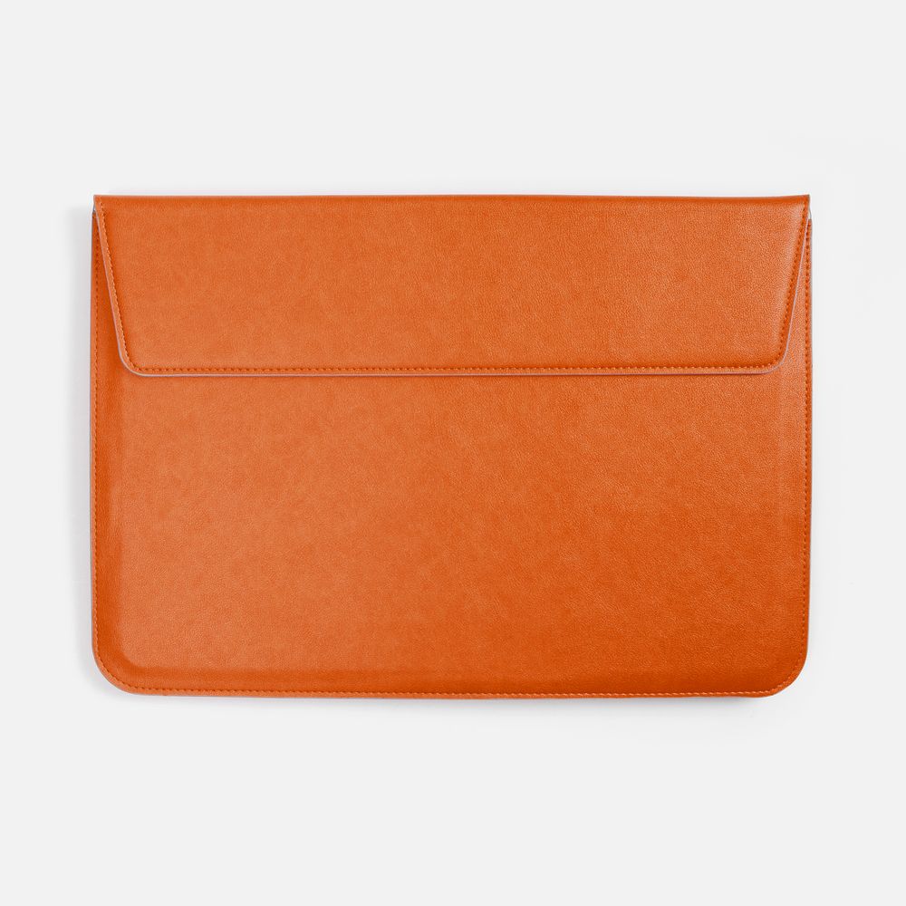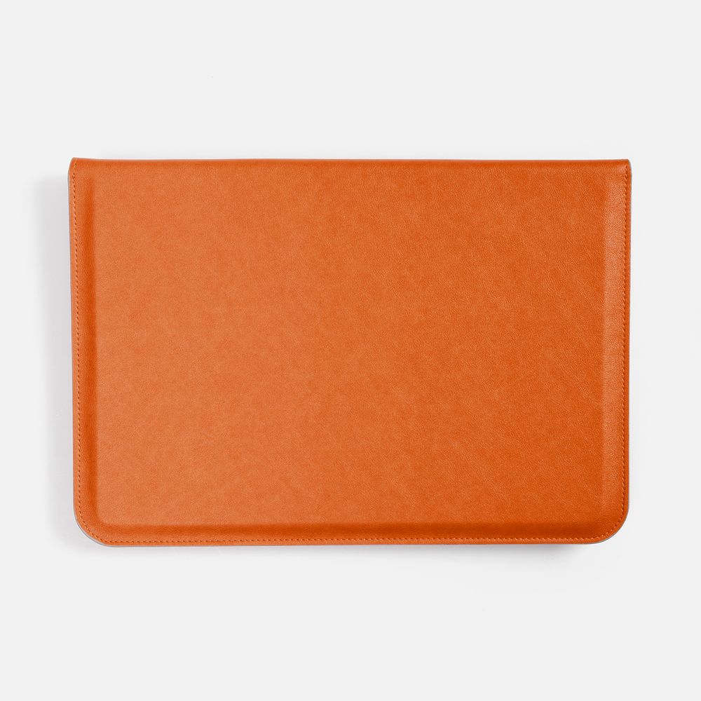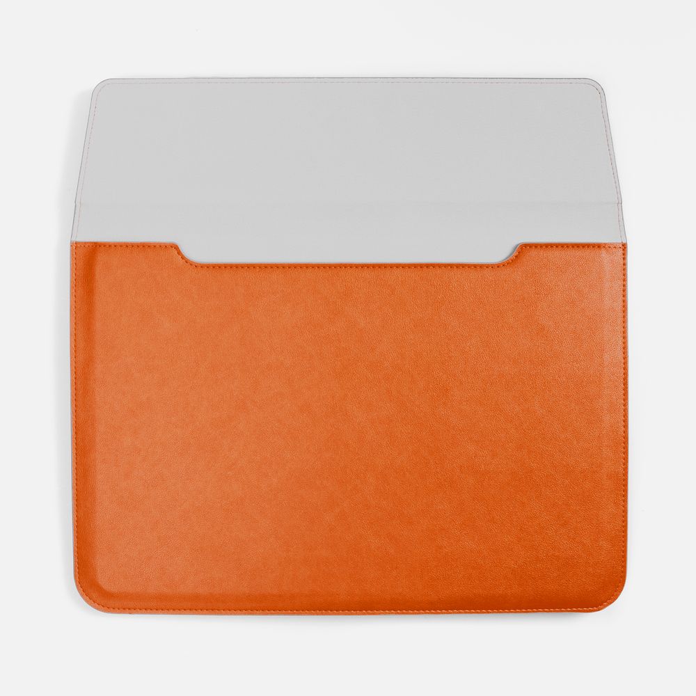 Чехол для ноутбука с диагональю до 15,6 выполнен из материала Petrus, оранжевого цвета, дополнен окрашенным срезом края серого цвета. Можно использовать в качестве папки для бумаг.