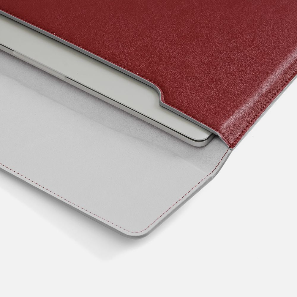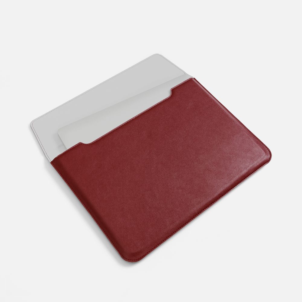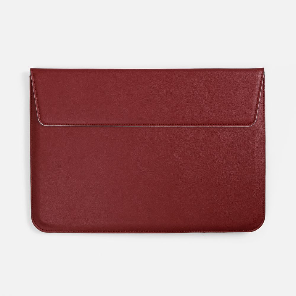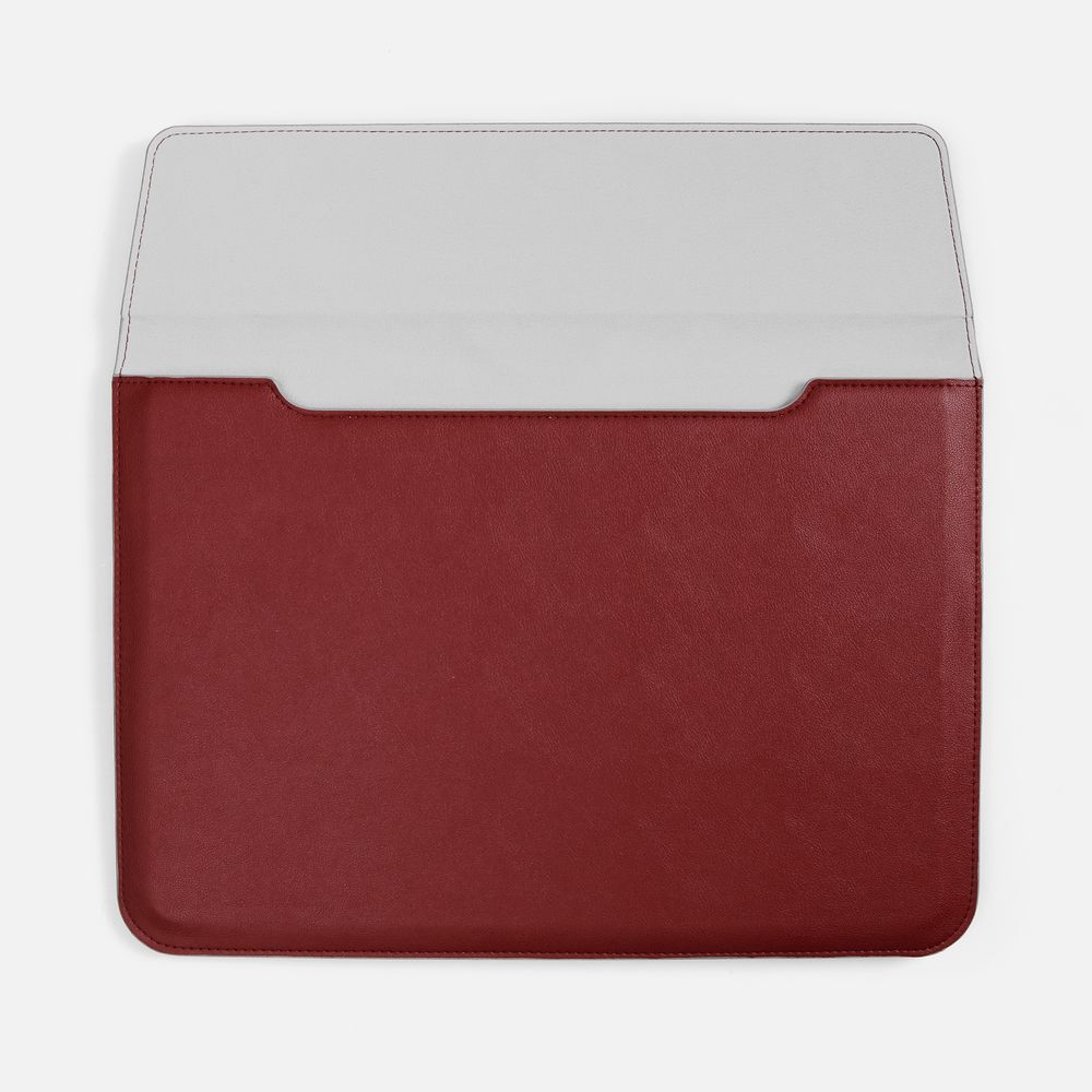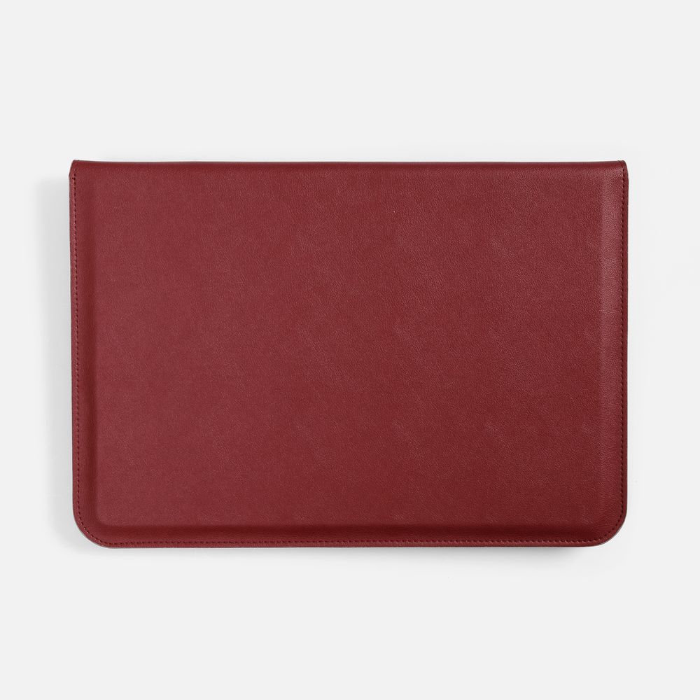 Чехол для ноутбука с диагональю до 15,6 выполнен из материала Petrus, красного цвета, дополнен окрашенным срезом края серого цвета. Можно использовать в качестве папки для бумаг.