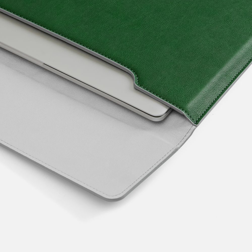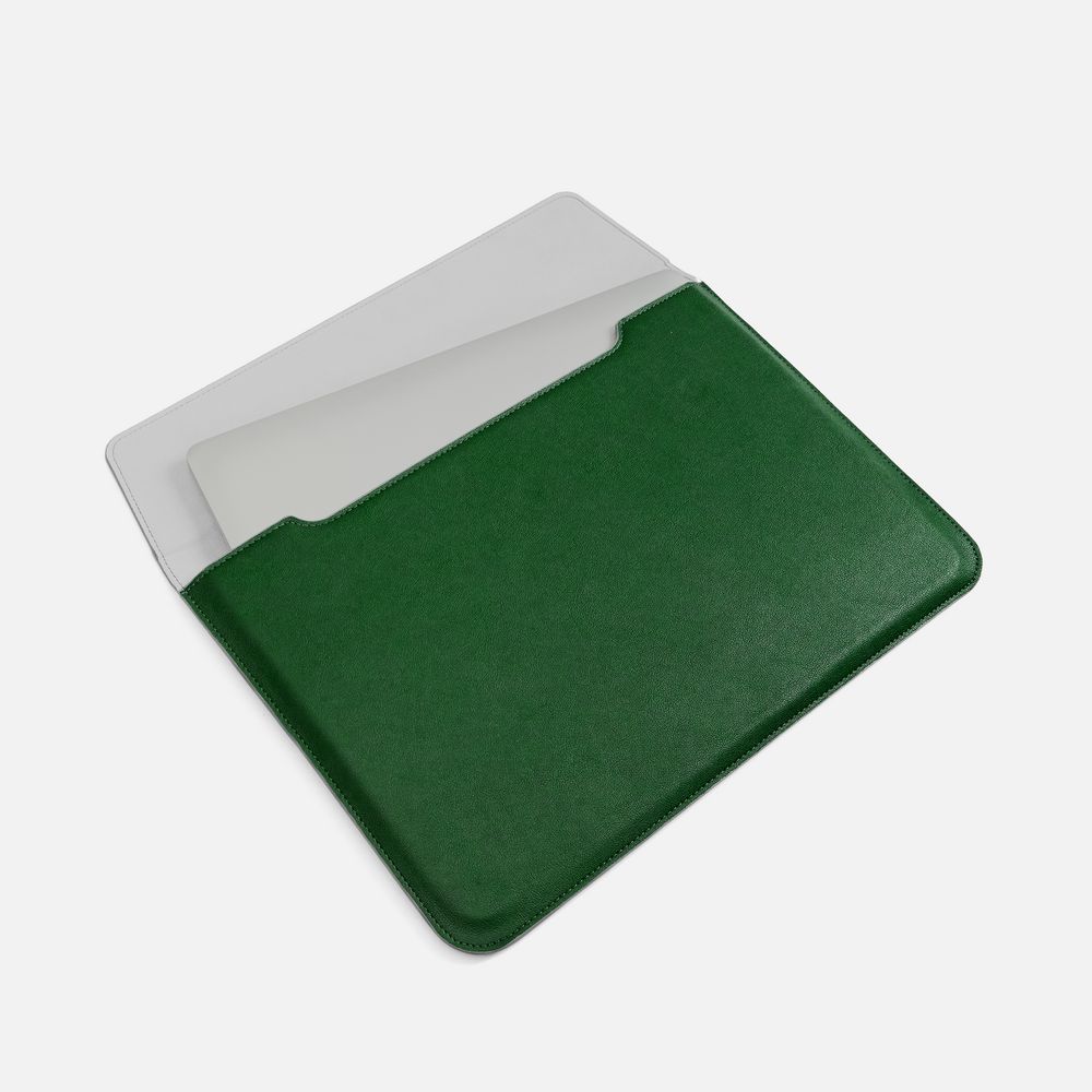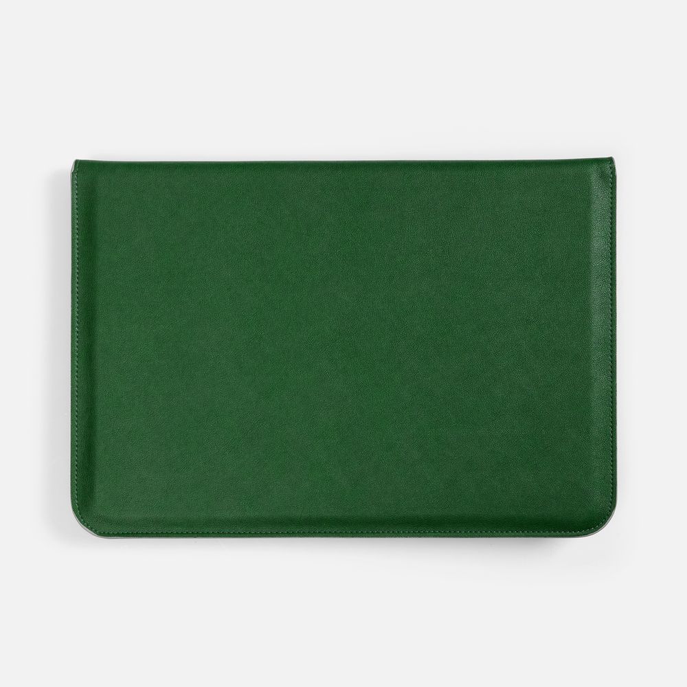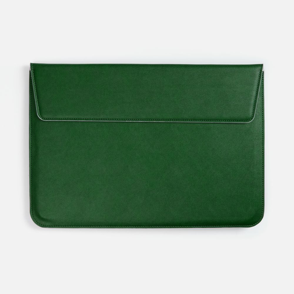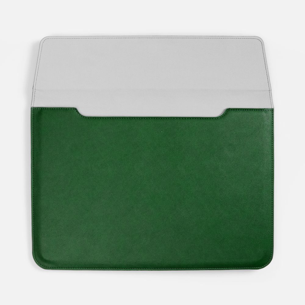 Чехол для ноутбука с диагональю до 15,6 выполнен из материала Petrus, зеленого цвета, дополнен окрашенным срезом края серого цвета. Можно использовать в качестве папки для бумаг.