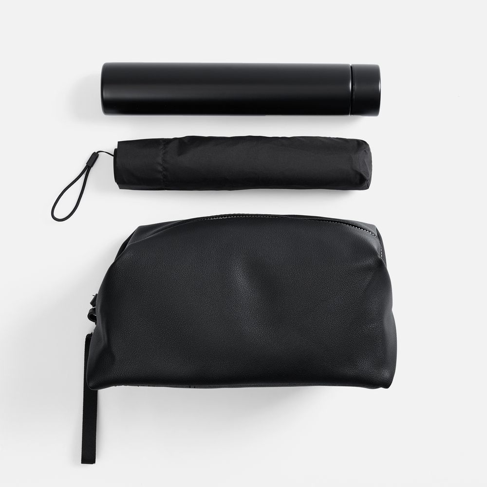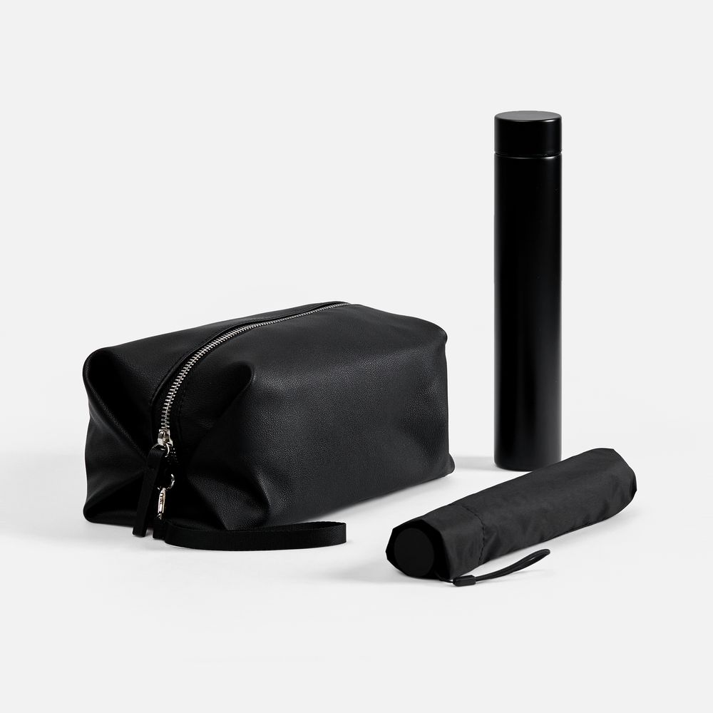 Размеры: несессер: 22х12х12 см, в сложении 23х14х4 см; зонт: длина 49 см, диаметр купола 90 см, длина в сложении 22 см; термобутылка: диаметр 4,3 см, высота 23,5 см