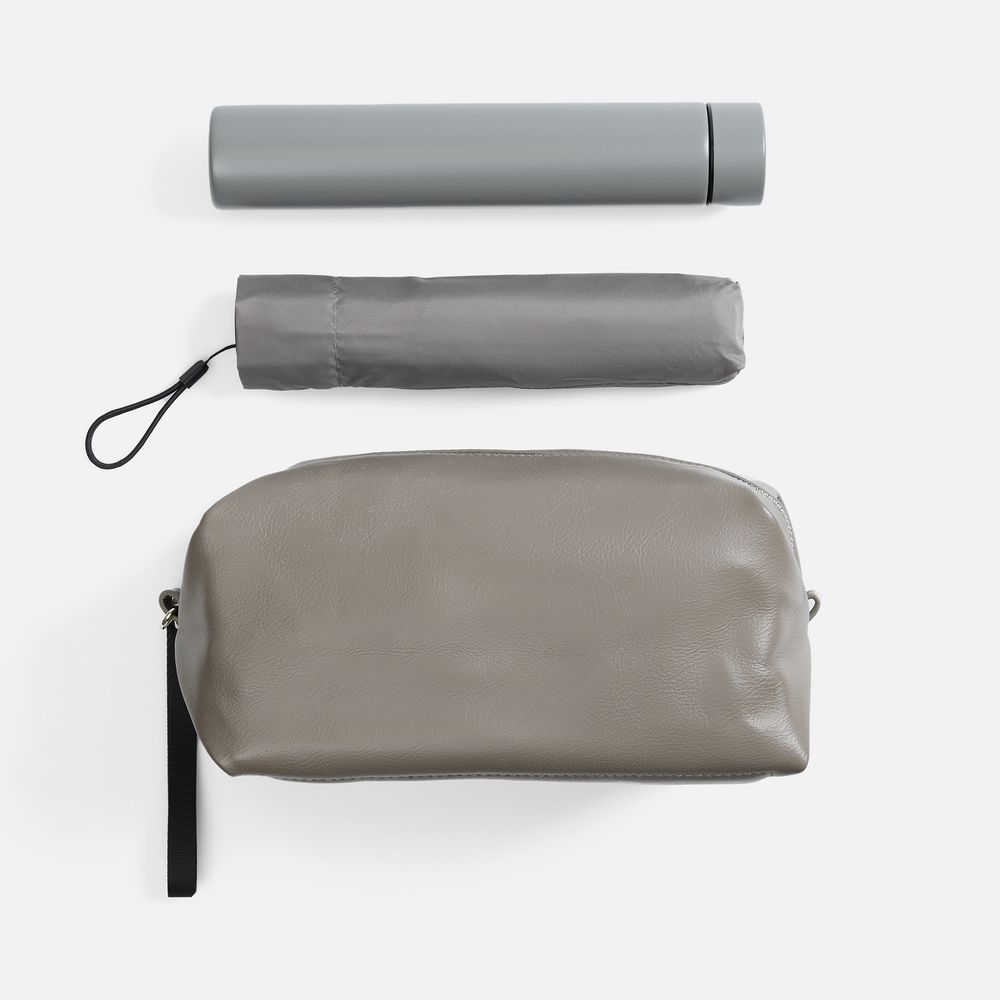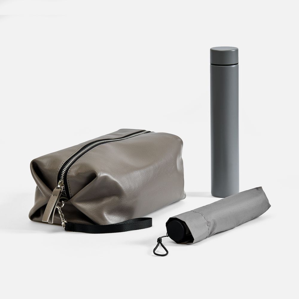 Размеры: несессер: 22х12х12 см, в сложении 23х14х4 см; зонт: длина 49 см, диаметр купола 90 см, длина в сложении 22 см; термобутылка: диаметр 4,3 см, высота 23,5 см