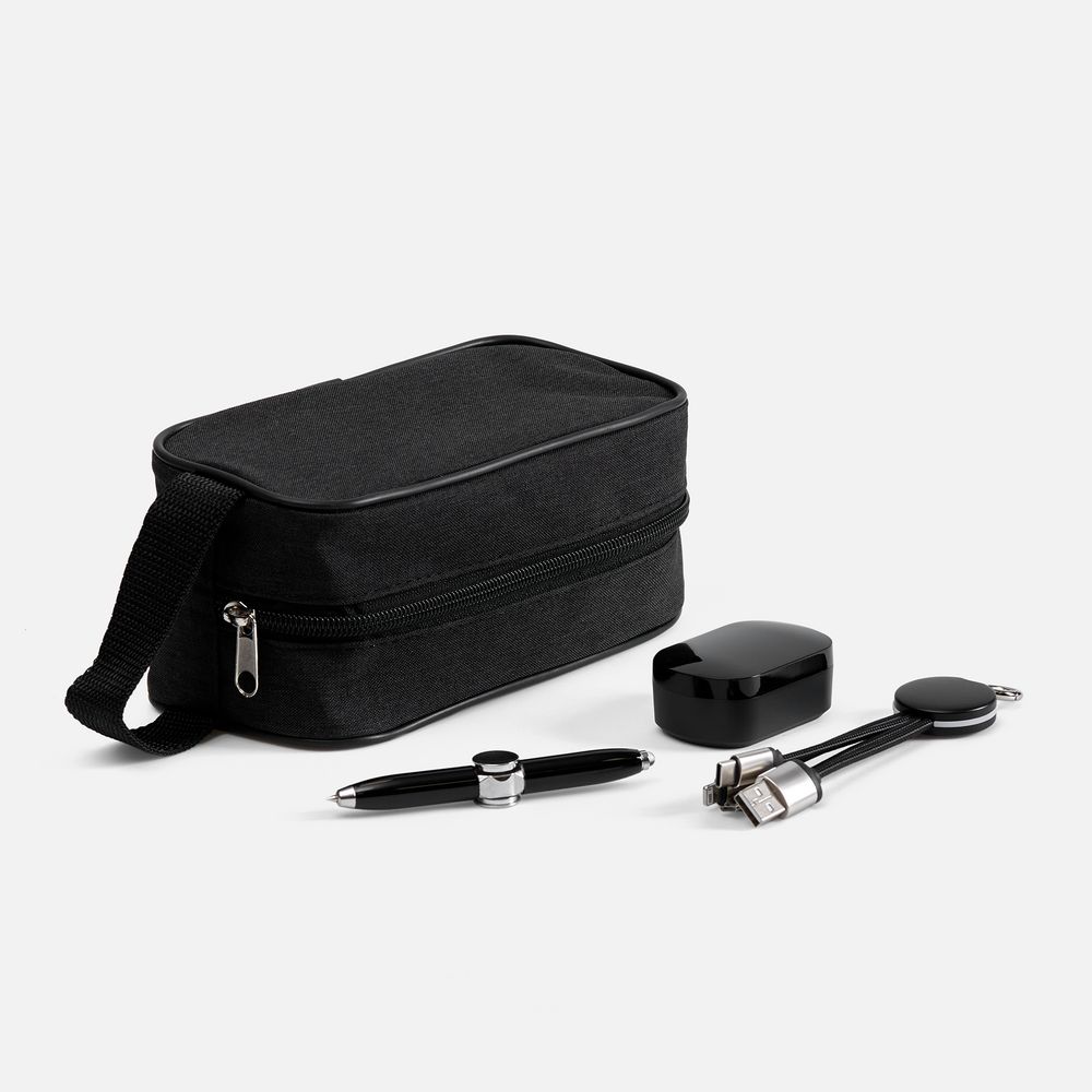 Легкие и емкие беспроводные наушники позволят всегда иметь доступ к качественному звуку, а благодаря встроенному микрофону— проводить срочные звонки даже во время поездки. Выдвижная подставка для смартфона сделает его использование более простым и удобным. Кабель-брелок со множеством типов разъемов —Type-C, Micro USB и Lightning—позволит всем устройствам всегда быть в полном заряде. Необычную ручку-спиннер Flipen приятно вращать ручку вокруг своей оси — полезно во время напряженной работы. Также ручка оборудована небольшим фонариком на верхней части корпуса. Все это легко помещается в практичный несессер — компактно и удобно.