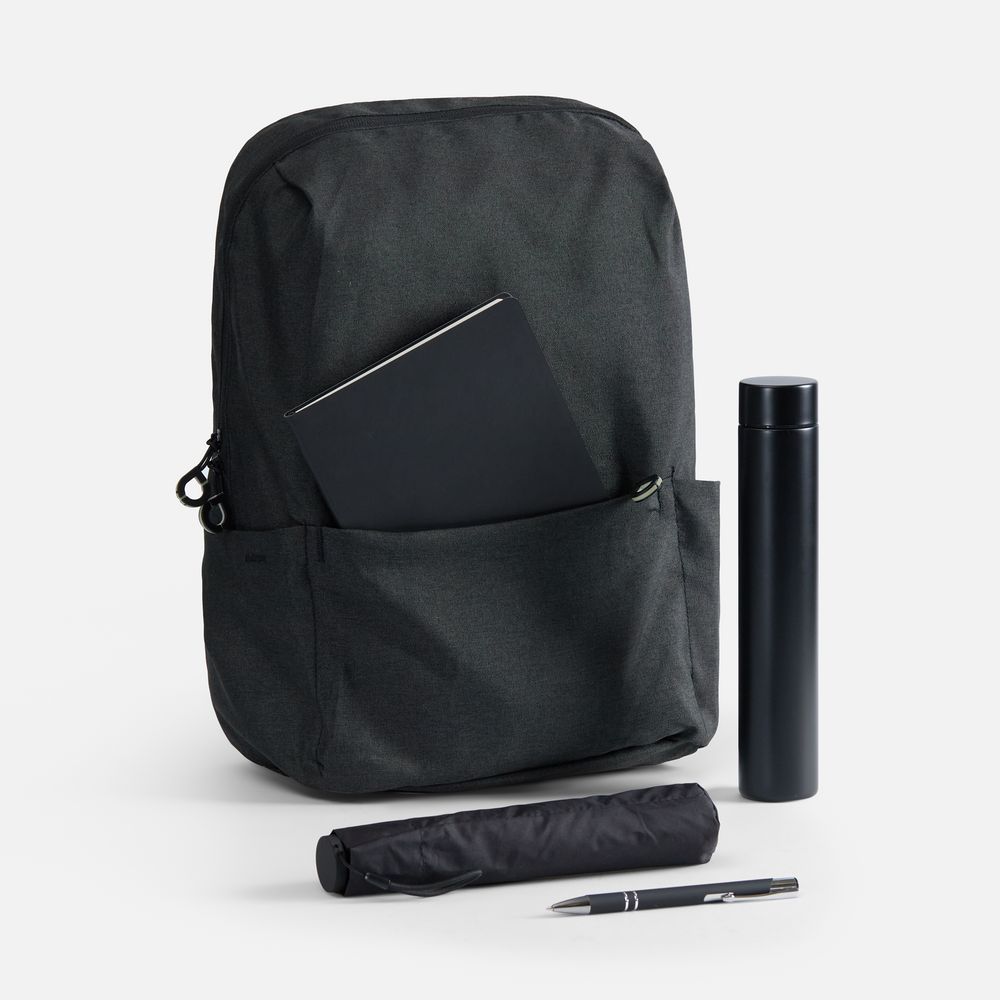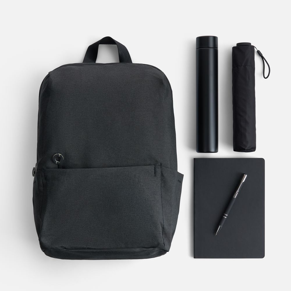 Размеры: рюкзак: 27x40x14 см; зонт: длина 49 см, диаметр купола 90 см, длина в сложении 22 см; термобутылка: высота 23,5 см, диаметр 4,3 см; блокнот: 15,5х21х1 см; ручка: 13,7х0,8 см