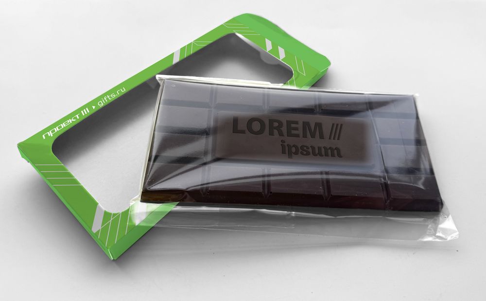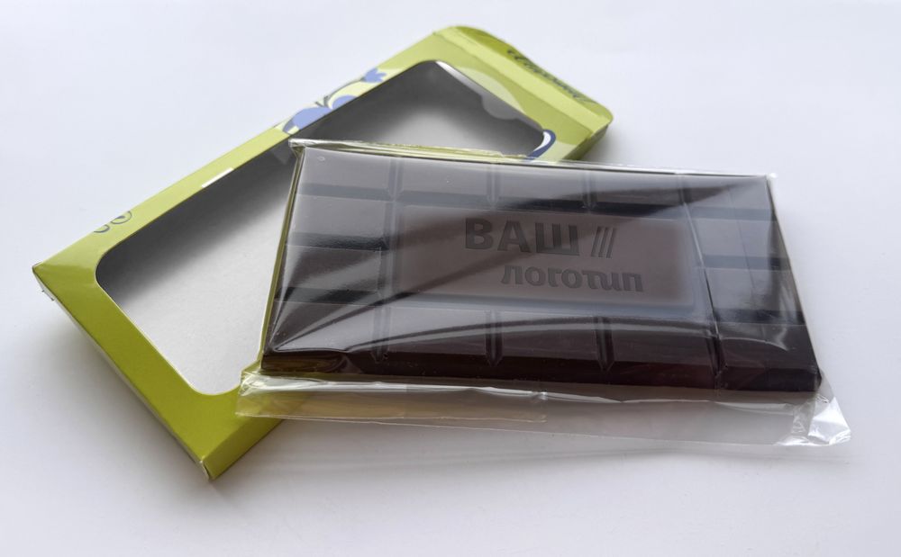 Барельефный шоколад с логотипом в индивидуальной упаковке с окошком.