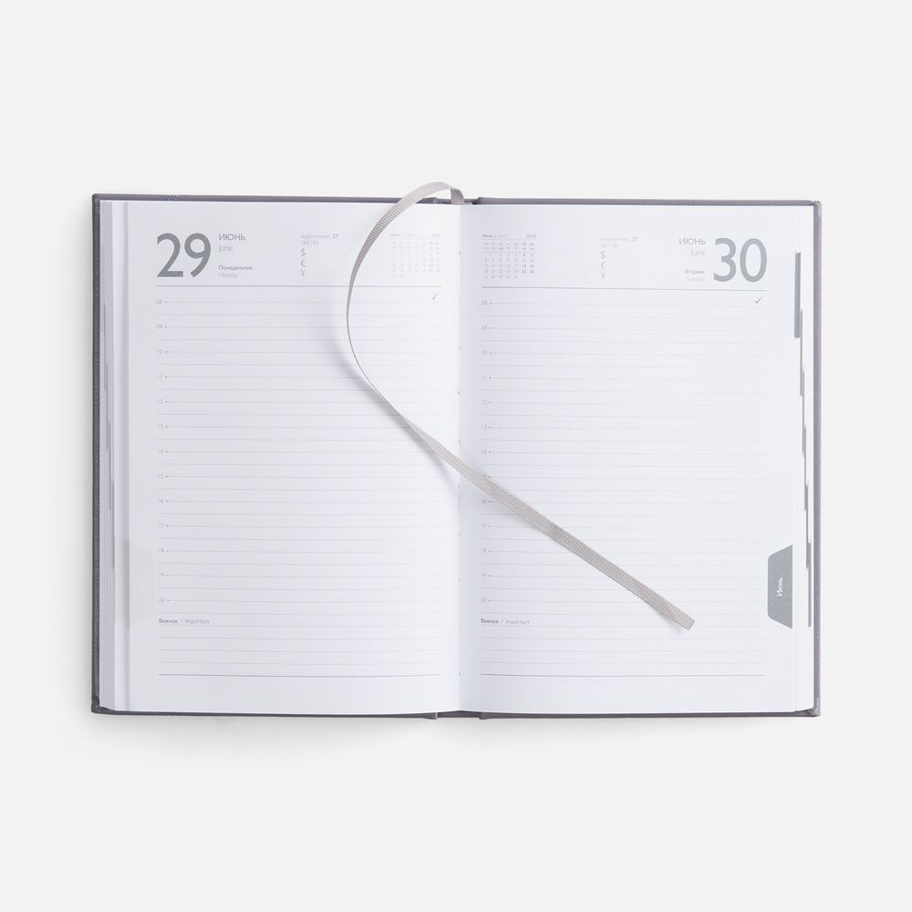 Ежедневник с твердой обложкой с поролоном из искусственной кожи, дополнен декоративной строчкой, капталом и ляссе в цвет ежедневника.
