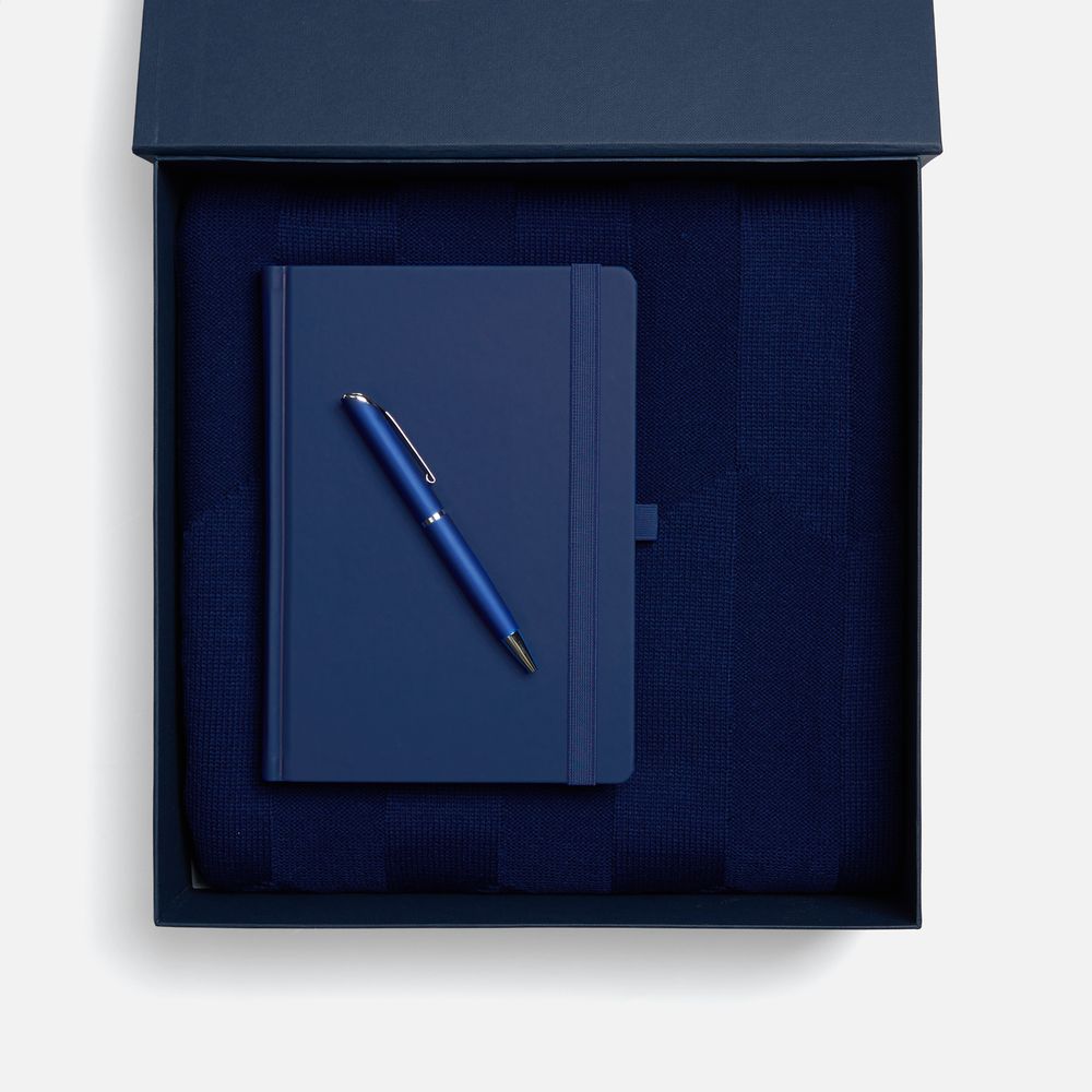 Однотонный набор с основной канцелярией и пледом — классика жанра в уютном исполнении. С компактным ежедневником будет удобно делать заметки в любое время — благодаря петельке для ручки любимый пишущий инструмент будет всегда под рукой. А изысканный акриловый плед с геометрическим узором позволит выразить самые теплые пожелания и ддобавит плавных линий в интерьер.