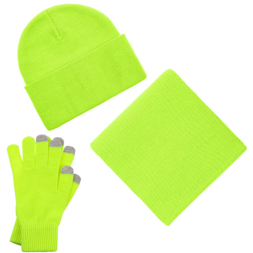 В комплект входят двухслойная шапка с регулируемым отворотом и легкий однослойный шарф из мягкой акриловой пряжи, сохраняющие тепло и защищающие от ветра, а также эргономичные перчатки со специальными токопроводящими волокнами на кончиках пальцев, позволяющие свободно пользоваться смартфоном даже в холодную погоду. Универсальная цветовая гамма и лаконичный дизайн делают набор органичным дополнением к любой верхней одежде.