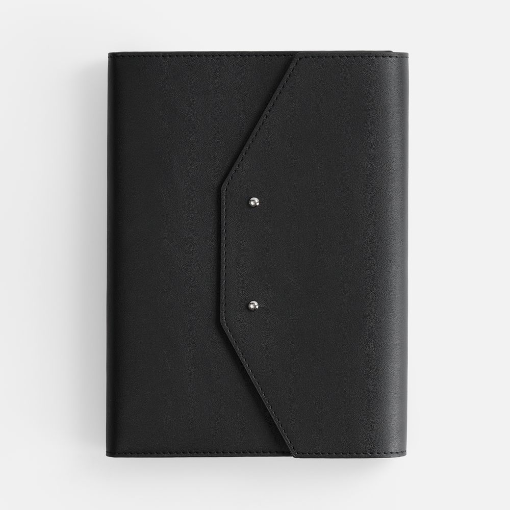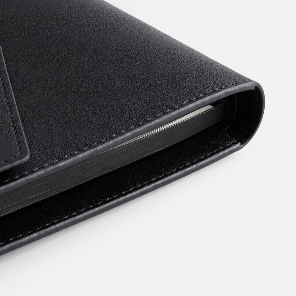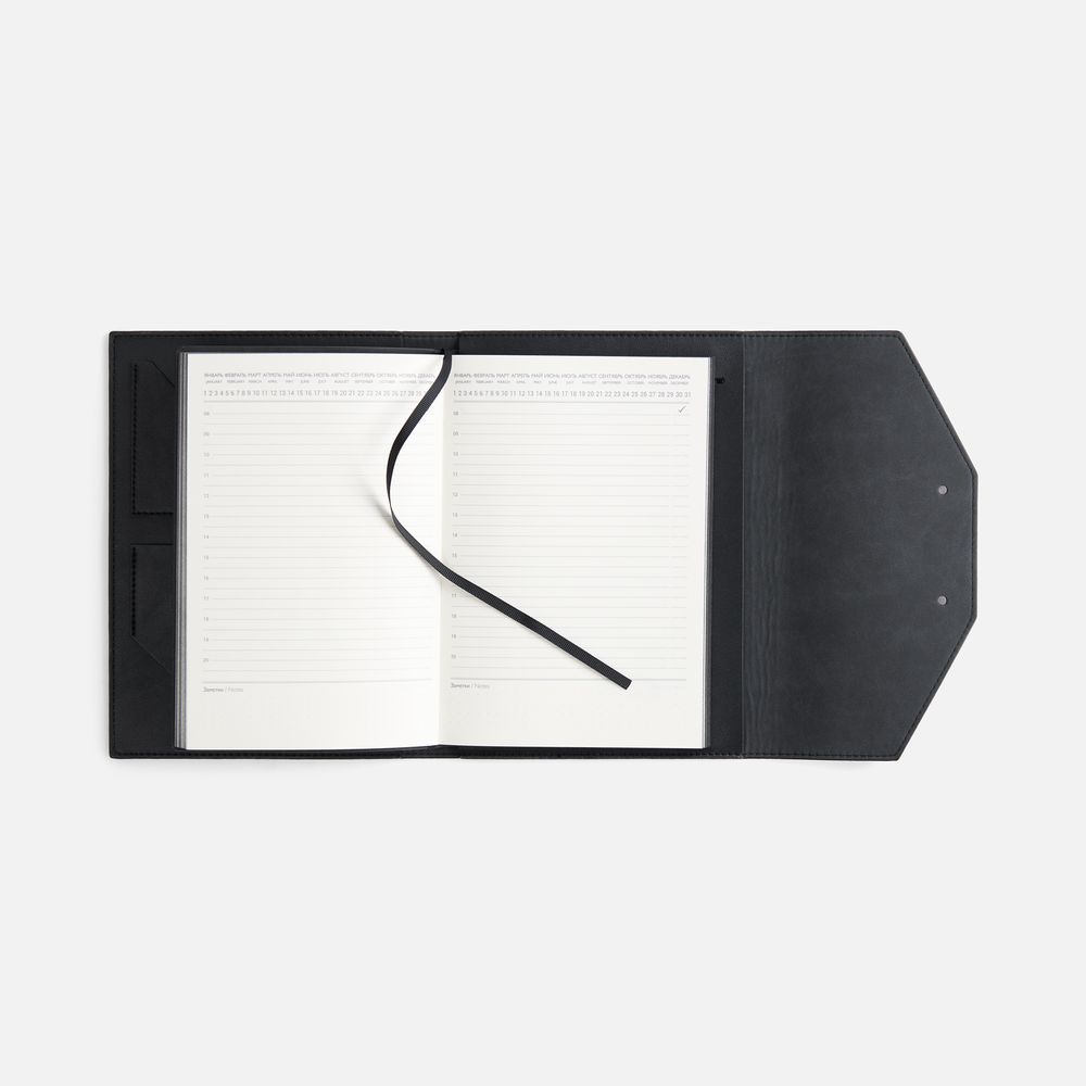 Ежедневник-органайзер в мягком переплете, формат А5+, с карманами для визиток и документов, петлей для ручки. Дополнен ляссе и капталом в цвет обложки. Клапан с прорезями застегивается на кобурные металлические кнопки.