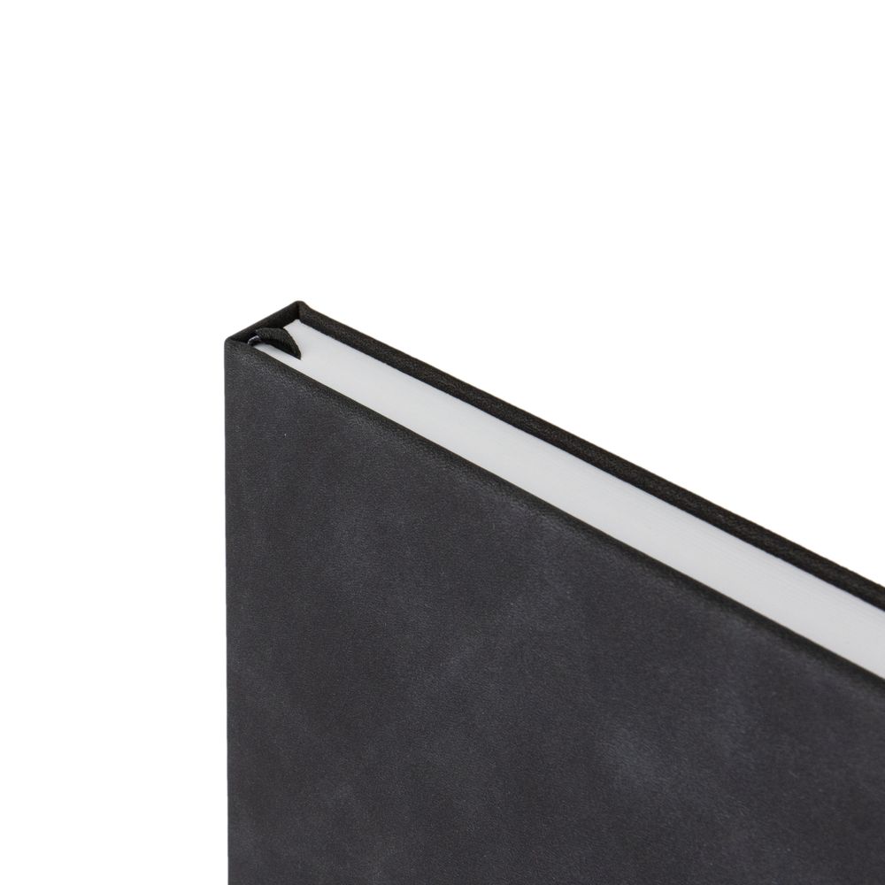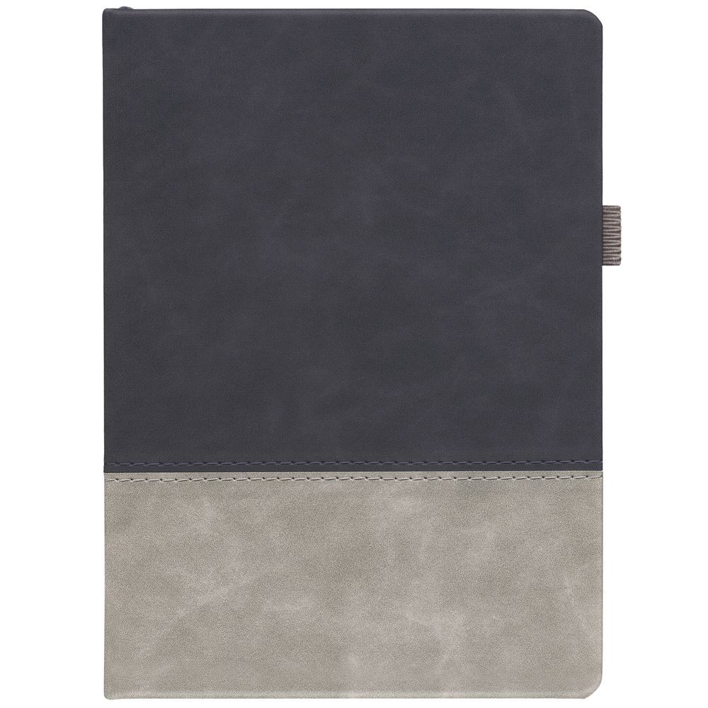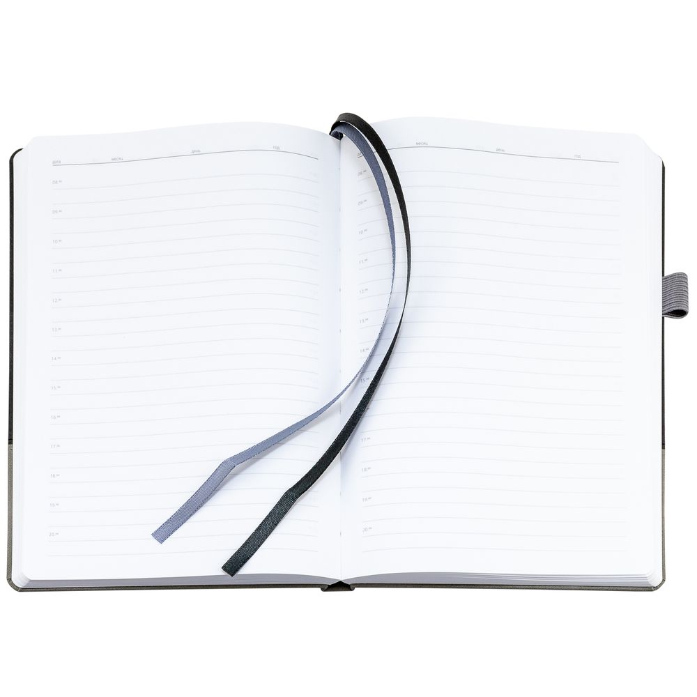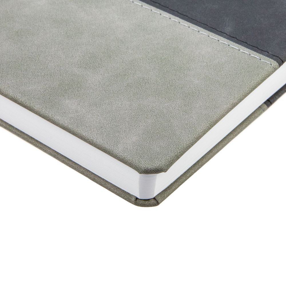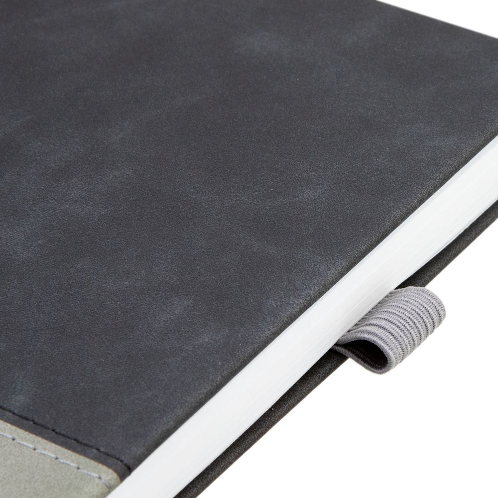 Ежедневник с твердой обложкой, без поролона, со сшивкой материалов Nubuck Touch, серый СС, и Nubuck Touch черный АА, дополнен двойным ляссе и петлей-резинкой для ручки.