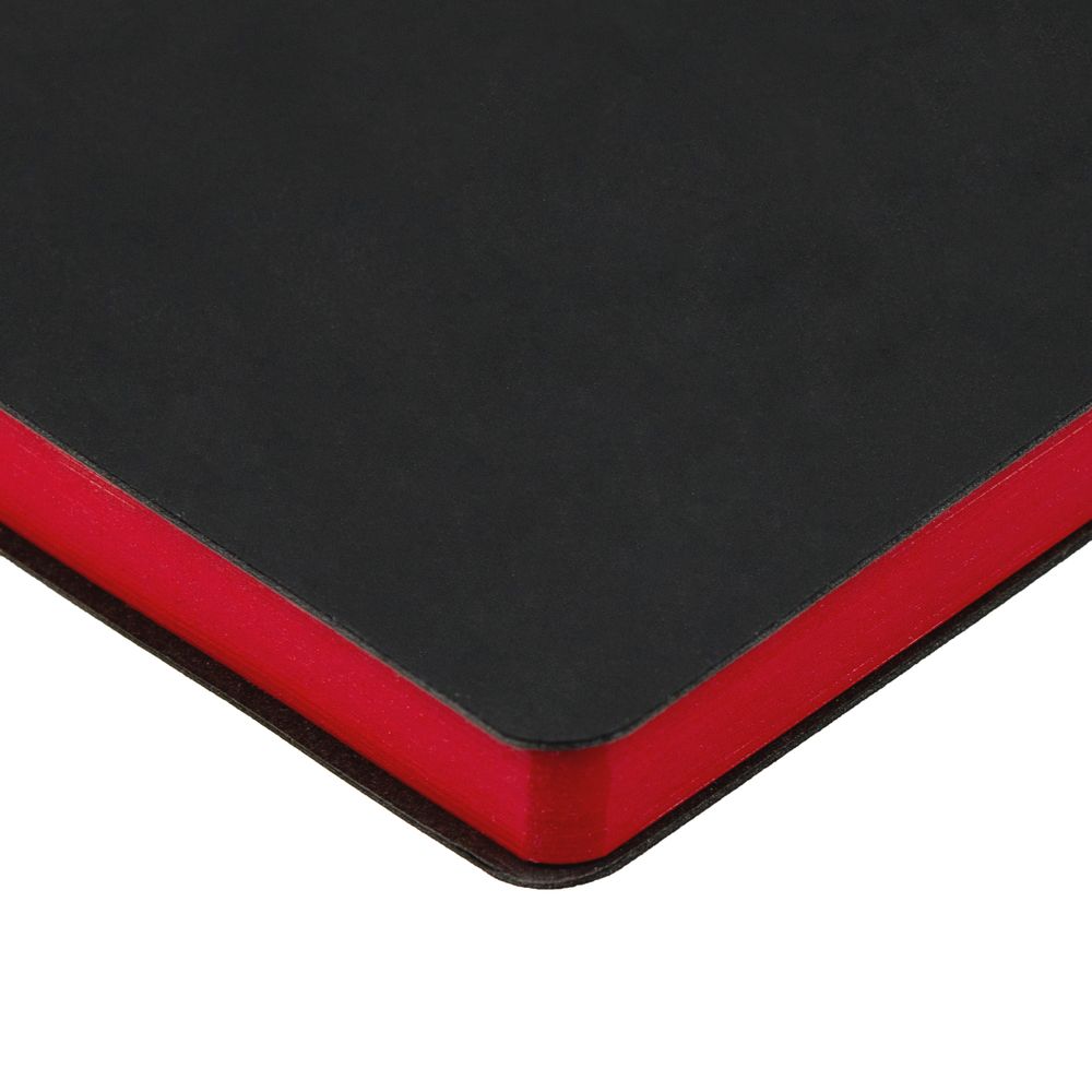Ежедневник с гибкой обложкой, выполнен из материала Soft Touch, черный АА, дополнен петлей для ручки из материала Nice Touch Ultra, красный РР и цветным ляссе.
