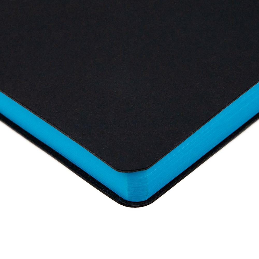 Ежедневник с гибкой обложкой, выполнен из материала Soft Touch, черный АА, дополнен петлей для ручки из материала Nice Touch, голубой JJ и цветным ляссе.