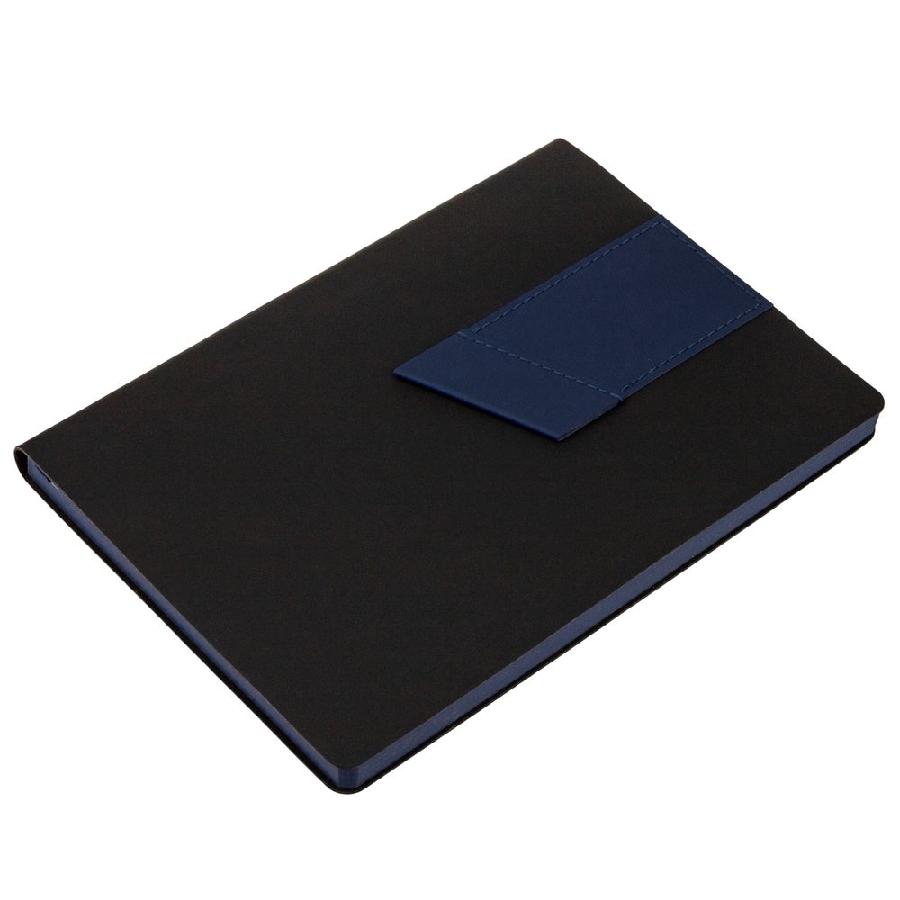 Ежедневник с гибкой обложкой, выполнен из материала Soft Touch, черный АА, дополнен петлей для ручки из материала Nice Touch, синий НН и цветным ляссе.