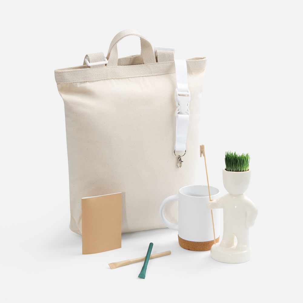 Материал: рюкзак - хлопок, плотность 280 г/м²; набор для выращивания Funky Headman - керамика; кружка - каменная керамика, подставка - пробка; коробка - микрогофрокартон, Т-23Е; лента - нейлон, пластик; металл; блокнот, ручка - картон