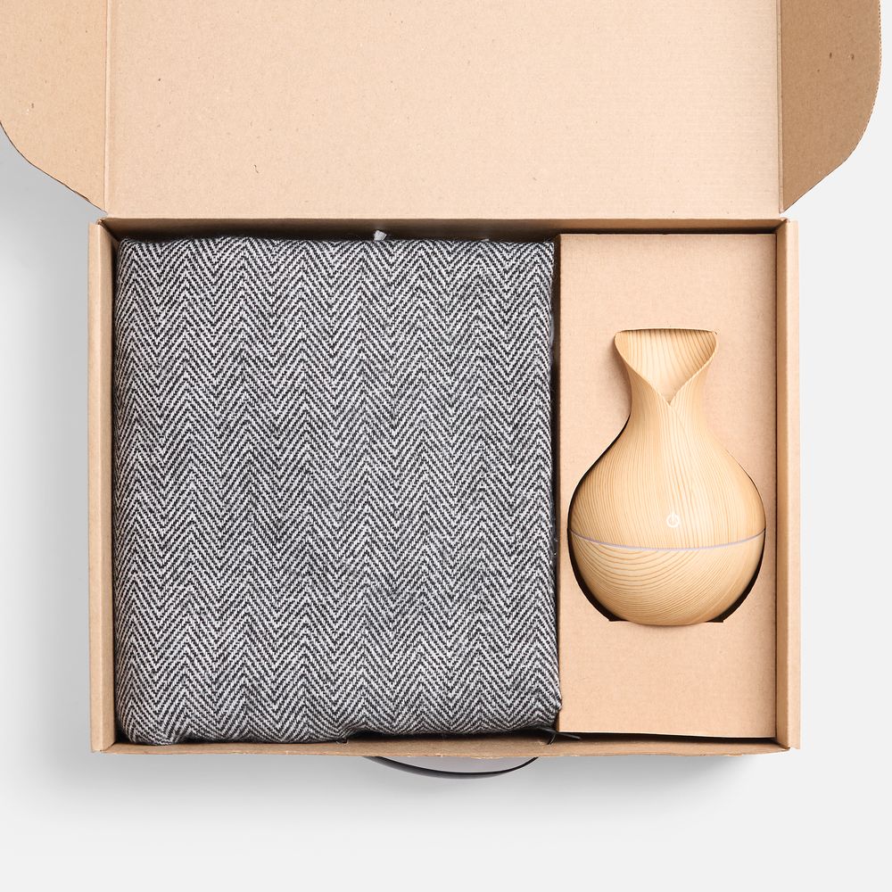 Мягкий плед нежных оттенков подарит тепло и комфорт, а изящный увлажнитель наполнит воздух свежестью и приятным ароматом. Этот набор — гармония красоты и функциональности, где каждый момент посвящен ценному отдыху и расслаблению.
