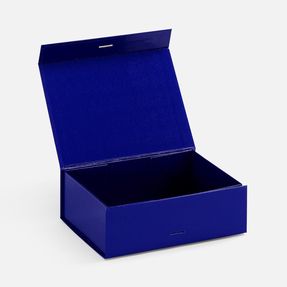 Коробка из переплетного картона с лайнером, ламинированым полуглянцевой текстурной пленкой и устойчивого к царапинам. Крышка на двух магнитах дополнительно фиксируется репсовой лентой.Толщина картона 2 мм. Поставляется в плоском виде. Сборка осуществляется на скотч.