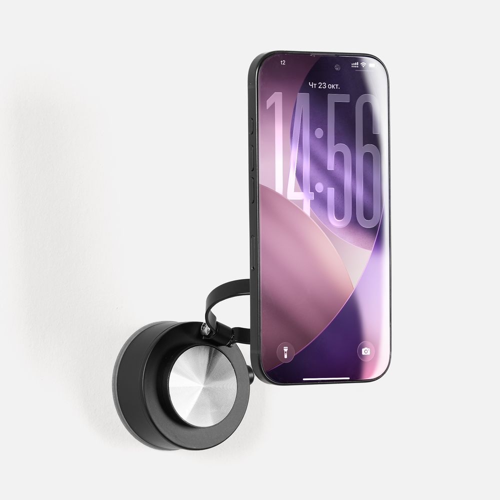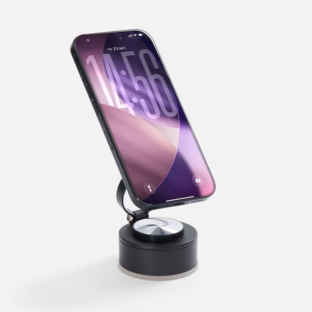 Подставка складывается и не занимает много места, ее удобно взять с собой на встречу или в дорогу. Поставляется в индивидуальной упаковке. Инструкция: 1. Закрепите нижнюю часть вакуумного магнитного держателя на чистой плоской поверхности. 2. Сдвиньте рычаг для активации вакуумной фиксации. 3. Для более надежного удержания смартфона на подставке прикрепите металлическое кольцо к задней части корпуса.