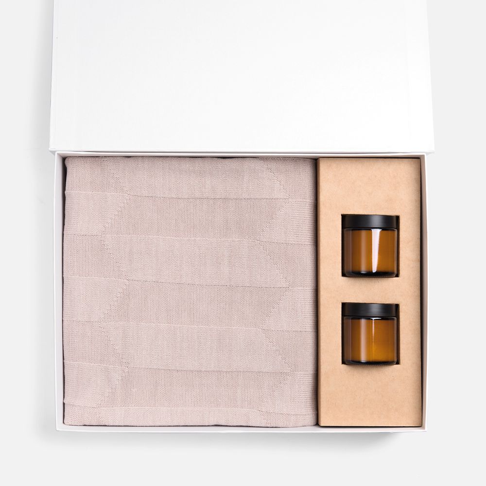Материал: плед - акрил 100%, плотность 286 г/м²; подсвечник - стекло, крышка - пластик; свеча - парафин, соевый воск, парфюмерная композиция; коробка - переплетный картон, бумага Majestic