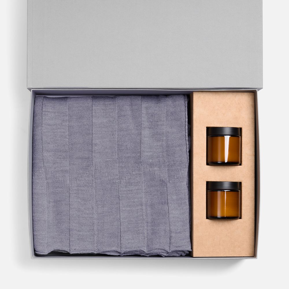 Материал: плед - акрил 100%, плотность 286 г/м²; подсвечник - стекло, крышка - пластик; свеча - парафин, соевый воск, парфюмерная композиция; коробка - переплетный картон, бумага Malmero